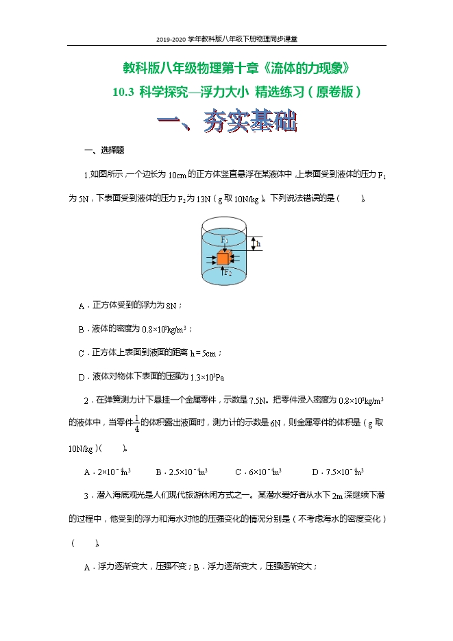 【精品】2019-2020学年教科版八年级下册物理同步课堂:10.3 科学探究—浮力的大小(课件 精选练习)