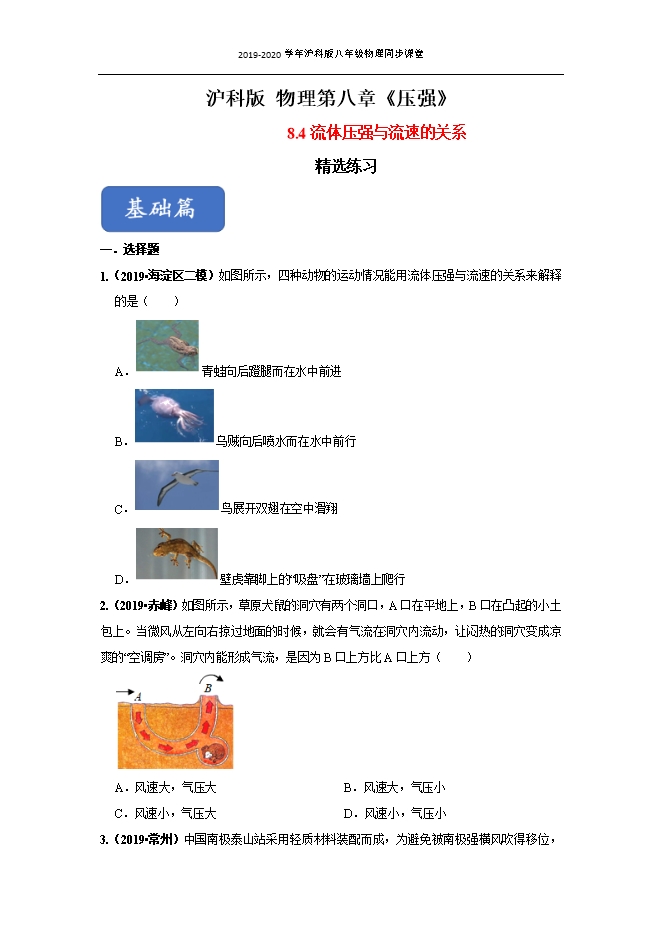 【精品】2019-2020学年沪科版八年级物理同步课堂:8.4流体压强与流速的关系(课件 精选练习)