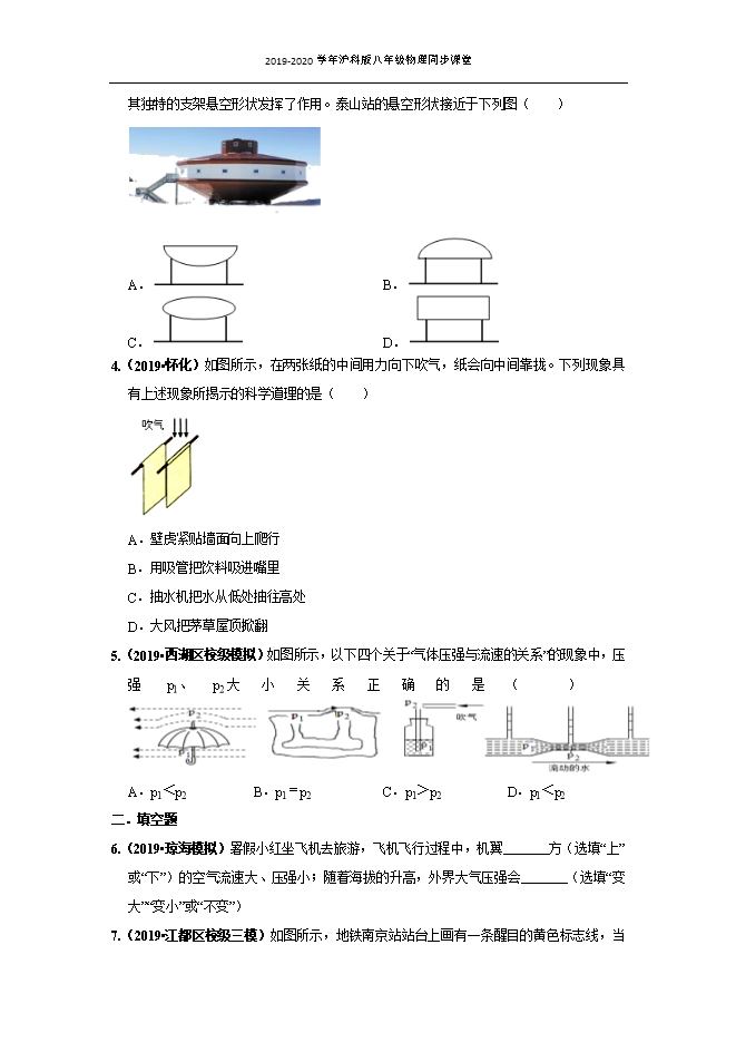 【内容简介】1.(2019•大连)下列事例中主要利用大气压工作的是( )A.活塞式抽水机B.密度计C.连通器D.飞机机翼【答案】A【解析】A、活塞式抽水机抽水时,使其内部气压小于外界大气压,在外界大气压的作用下将水压入抽水机内,进而达到把水从低处压到高处的目的,故A正确;B、密度计是利用了物体的漂浮条件和阿基米德原理工作的,与大气压无关,故B错误;C、连通器里的同种液体在不流动时,连通器各部分的液面高度相平,与大气压无关,故C错误;D、飞机的机翼上凸下平,是利用流体压强与流速的关系来获得升力的,故D错误。故选:A。2.(2019•宁夏)厨房中的抽油烟机能将油烟“吸”走。下列现象中“吸”的物理原理与其相同的是( )A.与头发摩擦过的气球能“吸”起纸屑B.拔火罐时罐子“吸”在皮肤上C.削平的铅柱挤压后会吸”在一起D.客车行驶时窗帘被“吸”出窗外【答案】D【解析】据流体压强与流速的关系可知,可知抽油烟机在工作时,由于转动的扇叶处气体的流速大,压强小,从而在周围大气压的作用下将油烟压向扇口排出。故厨房内的抽油烟机工作时是利用流速越大,压强越小的方法将油烟“吸”走的;A、与头发摩擦过的气球能“吸”起纸屑,这是因为带电体可以吸引轻小物体;故A不符合题意;B、拔火罐使用时,先把酒精在罐内烧一下,罐内空气受热排出,此时迅速把罐扣在皮肤上,使罐内气体温度升高,等到罐内的空气冷却后压强降低,小于外面的大气压,外面的大气压就将罐紧紧地压在皮肤上。因此这是由于大气压强的作用引起的,故B不符合题意;C、削平的铅柱压紧后能“吸”在一起,因为分子间有引力,故C不符合题意;D、行驶的汽车,车外的空气流速快、压强小,车内的空气流速小、压强大,向外的压强差就把窗帘压向窗外,故D符合题意。故选:D。3.(2019秋•贡井区校级月考)如图所示的是测量大气压强的装置,玻璃管长约1m,槽内装有水银,下列说法正确的是( ) A.第一次利用此装置测出大气压强的科学家是托里拆利B.此装置是一个连通器C.玻璃管竖直放置时测出的大气压强一定为76cm汞柱高D.将此装置从山脚移到山顶,管内外汞液面高度差增加【答案】A【解析】A、第一次利用此装置测出大气压强的科学家是托里拆利,故A正确;B、连通器是上端开口,下端连通的装置,因为玻璃管的上端是封闭的,所以此装置不是连通器,故B错误;C、因大气压是变化大,其大小与高度、天气等有关,所以玻璃管竖直放置时测出的大气压强不一定为76cm汞柱高,故C错误;D、因大气压强随高度的升高而降低,故将此装置从山脚移到山顶,管内托起的水银液面高度差减小,故D错误;故选:A。