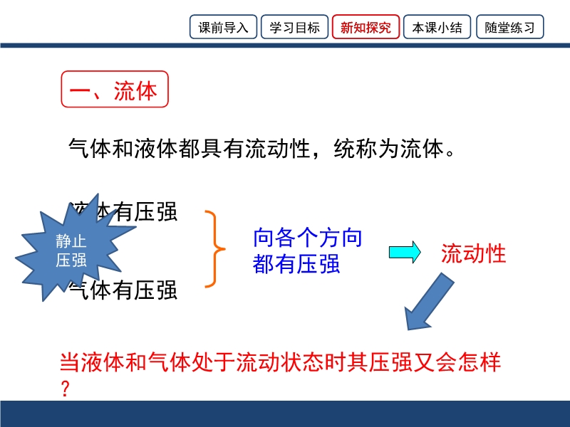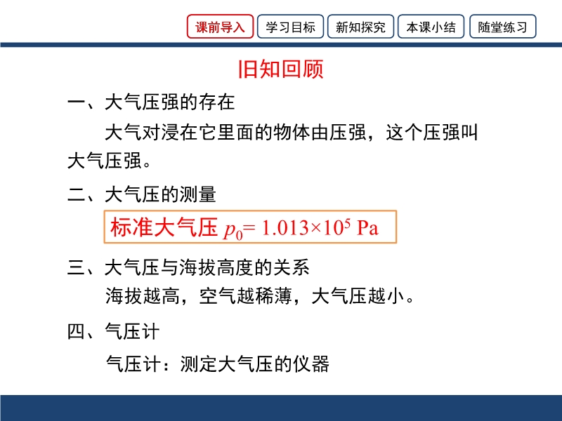 【内容简介】一、大气压强的存在 大气对浸在它里面的物体由压强,这个压强叫大气压强。二、大气压的测量三、大气压与海拔高度的关系海拔越高,空气越稀薄,大气压越小。四、气压计气压计:测定大气压的仪器在流体中,流速越大的位置压强越小,流速越小的位置压强越大。