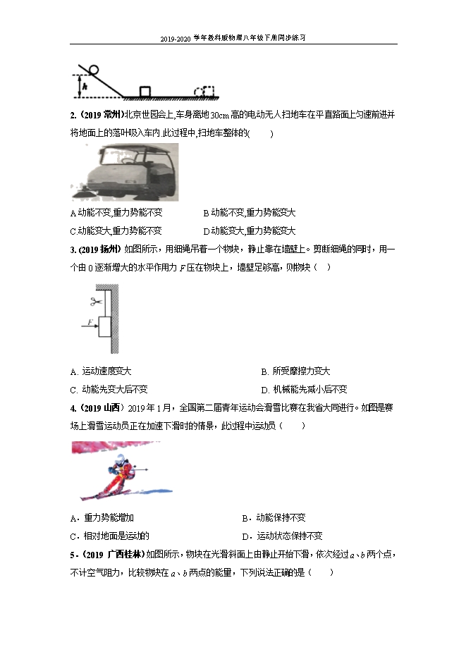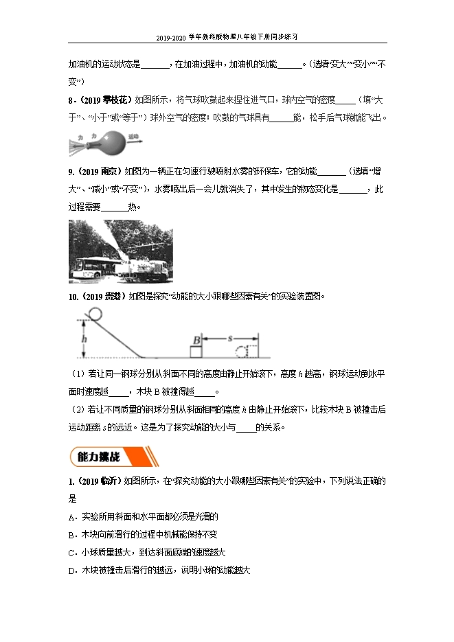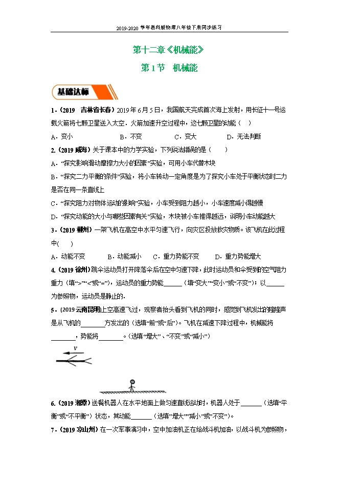 【内容简介】1.(2019 吉林省长春)2019年6月5日,我国航天完成首次海上发射,用长征十一号运载火箭将七颗卫星送入太空.火箭加速升空过程中,这七颗卫星的动能( )A.变小B.不变 C.变大 D.无法判断【答案】C【解析】动能的大小与速度和质量有关,火箭加速升空的过程中,质量不变,速度变大,则动能变大,故C选项正确。2.(2019威海)关于课本中的力学实验,下列说法错误的是( )A.“探究影响滑动摩擦力大小的因素”实验,可用小车代替木块B.“探究二力平衡的条件”实验,将小车转动一定角度是为了探究小车处于平衡状态时二力是否在同一条直线上C.“探究阻力对物体运动的影响”实验,小车受到阻力越小,小车速度减小得越慢D.“探究动能的大小与哪些因素有关”实验,木块被小车推得越远,说明小车动能越大【答案】A【解析】:A.探究影响滑动摩擦力大小的因素”实验中,若用小车代替木块,变滑动为滚动,减小了摩擦力,从而对测量摩擦力大小带来了困难,A错误;B.“探究二力平衡的条件”实验,将小车转动一定角度,小车在水平方向上受到两个力不在同一直线上,是为了探究小车处于平衡状态时二力是否在同一条直线上,B正确;C.由实验现象可以看出:小车受的阻力越小,小车运动的路程越远,速度减小得越慢,C正确;D.“探究动能的大小与哪些因素有关”实验,根据转换法,木块被小车推得越远,说明小车动能越大,D正确。3.(2019郴州)一架飞机在高空中水平匀速飞行,向灾区投放救灾物质。该飞机在此过程中( )A.动能不变 B.动能减小 C.重力势能不变 D.重力势能增大【答案】B【解析】一架飞机在高空中水平匀速飞行,高度不变、速度不变,向灾区投放救灾物资时,飞机的质量减小,所以飞机的动能和重力势能都减小。故选:B。4.(2019徐州)跳伞运动员打开降落伞后在空中匀速下降,此时运动员和伞受到的空气阻力 重力(填“”“”或“=”),运动员的重力势能 (填“变大”“变小”或“不变”);以 为参照物,运动员是静止的.【答案】=;变小;降落伞。【解析】(1)由于跳伞运动员和伞在空中匀速直线下降,处于平衡状态,所以人和伞受到的总重力与空气阻力是一对平衡力,大小相等,方向相反;(2)当降落伞张开后,运动员匀速下降时,质量不变,高度减小,重力势能变小。(3)跳伞运动员相对于降落伞位置保持不变,故以降落伞为参照物,跳伞运动员是静止的。5.(2019云南昆明)上空高速飞过,观察者抬头看到飞机的同时,感觉到飞机发出的隆隆声是从飞机的________方发出的(选填“前”或“后”)。飞机在减速下降过程中,机械能将________,势能将________。(选填“增大”、“不变”或“减小”) 【答案】 (1). 后 (2). 减小 (3). 减小【解析】第一空.因为光的速度大于声音的速度,所以观察者抬头看到飞机的同时,感觉到飞机发出的隆隆声是从飞机的后方发出的;飞机在减速下降过程中,质量不变,速度和高度都变小,第二空.动能和重力势能都减小,机械能为动能和势能之和,所以机械能将减小;第三空.质量不变,高度减小,重力势能减小;6.(2019湘潭)送餐机器人在水平地面上做匀速直线运动时,机器人处于 (选填“平衡”或“不平衡”)状态,其动能 (选填”增大””减小”或”不变”)。【答案】 (1). 平衡 (2). 不变【解析】平衡状态是指静止状态或匀速直线运动状态,由于机器人在水平地面上做匀速直线运动,所以机器人处于平衡状态;又因为此过程中机器人的质量和速度不变,所以动能不变。