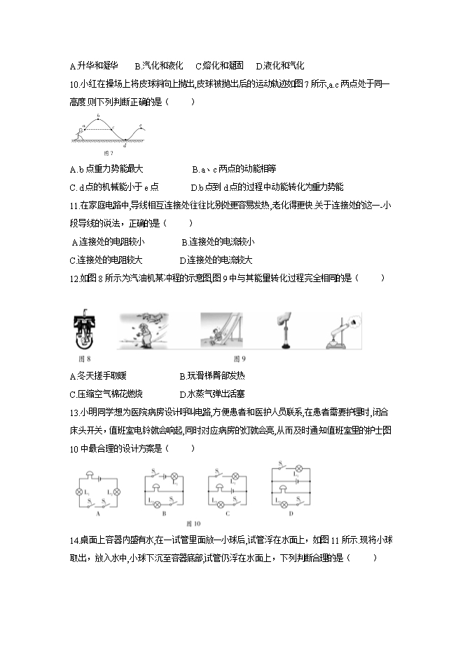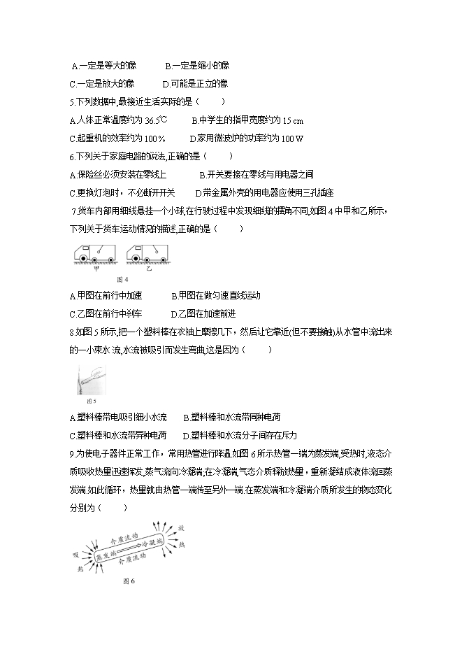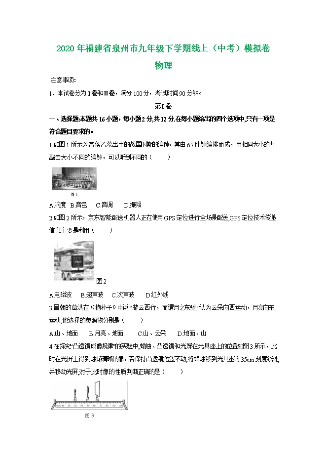 【内容简介】一、选择题:本题共16小题,每小题2分,共32分.在每小题给出的四个选项中,只有一项是符合题目要求的。1.如图1所示为曾侯乙墓出土的战国时期的编钟,其由65件钟编排而成,用相同大小的力敲击大小不同的编钟,可以听到不同的( ) A.响度 B.音色 C.音调 D.振幅【答案】C【解析】编钟的型号、大小不同,用相同大小的力敲击不同的编钟时,编钟振动的频率不同,故产生声音的音调不同.故选C.2.如图2所示,京东智能配送机器人正在使用GPS定位进行全场景配送,GPS定位技术传递信息主要是利用( ) 图2A.电磁波 B.超声波 C.次声波 D.红外线【答案】A【解析】GPS定位技术主要利用电磁波传递信息.故选A.3.晋朝的葛洪在《抱朴子》中说:“游云西行,而谓月之东驰.”认为云朵向西运动,月亮向东运动,他选择的参照物分别是( ) A.山、地面 B.月亮、地面 C.山、云朵 D.地面、山【答案】C【解析】以山或月亮为参照物,云朵的位置在改变,就会感觉云朵是向西运动的;以云朵为参照物.月亮的位置在改变,就会感觉月亮向东运动,ABD错误,C正确.故选C.4.在探究“凸透镜成像规律”的实验中,蜡烛、凸透镜和光屏在光具座上的位置如图3所示,此时在光屏上得到烛焰清晰的像,若保持凸透镜位置不动,将蜡烛移到光具座的35cm刻度线处,并移动光屏,对于此时像的性质判断正确的是( ) A.一定是等大的像 B.一定是缩小的像C.一定是放大的像 D.可能是正立的像【答案】C【解析】由图知,物距大于像距,此时成倒立缩小的实像,因此物距大于2倍焦距,像处于1倍和2倍焦距之间.物距u=50 cm-30 cm=20 cm;像距v=65 cm-50 cm=15 cm.由上分析得:20 c 10 cm,将蜡烛移到光具座的35 cm刻度处时,物距u=50 cm-35 cm=15 cm,蜡烛处于1倍和2倍焦距之间,所以成倒立、放大的实像.故选C.5.下列数据中,最接近生活实际的是( )A.人体正常温度约为36.5℃ B.中学生的指甲宽度约为15 cmC.起重机的效率约为100 % D.家用微波炉的功率约为100 W【答案】A【解析】人体正常温度在36C -37C之间,A符合实际;中学生的指甲宽度约为1 cm,B不符合实际;起重机的效率不可能达到100% ,C不符合实际;微波炉的功率约为1000 W ,D不符合实际.故选A.6.下列关于家庭电路的说法,正确的是( ) A.保险丝必须安装在零线上 B.开关要接在零线与用电器之间C.更换灯泡时,不必断开开关 D.带金属外壳的用电器应使用三孔插座【答案】D【解析】家庭电路中,保险丝必须安装在火线上,A错误;开关应该接在火线和用电器之间,B错误;更换灯泡时,应先断开开关,C错误;带金属外壳的用电器应该接地,所以需要使用三孔插座,D正确.故选D.