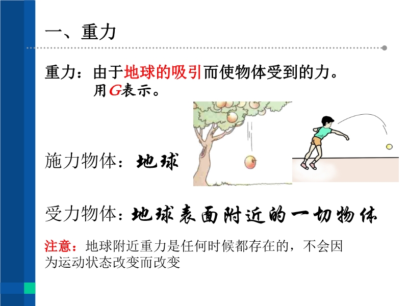 【内容简介】1. 重力:由于地球的吸引而使物体受到的力,符号 G。2. 重力的大小:物体所受的重力与物体的质量成正比。 3. 重力的方向:竖直向下4. 重力的作用点:重 心