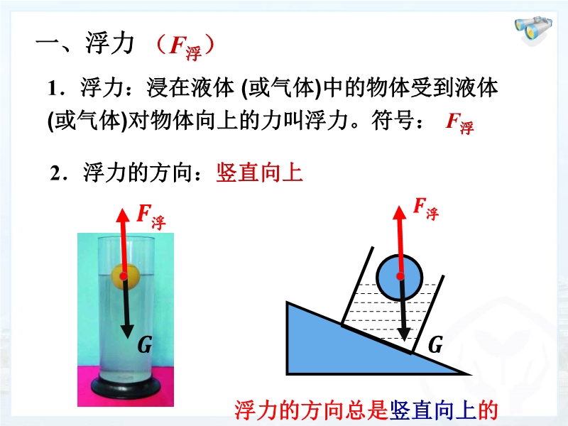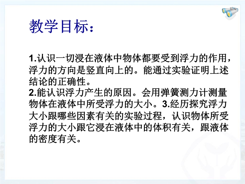 【内容简介】1.认识一切浸在液体中物体都要受到浮力的作用,浮力的方向是竖直向上的。能通过实验证明上述结论的正确性。2.能认识浮力产生的原因。会用弹簧测力计测量物体在液体中所受浮力的大小。3.经历探究浮力大小跟哪些因素有关的实验过程,认识物体所受浮力的大小跟它浸在液体中的体积有关,跟液体的密度有关。物体在液体中所受的浮力大小,跟它浸在液体中的体积有关,跟液体的密度有关。浸在液体中的体积越大、液体的密度越大,浮力就越大。