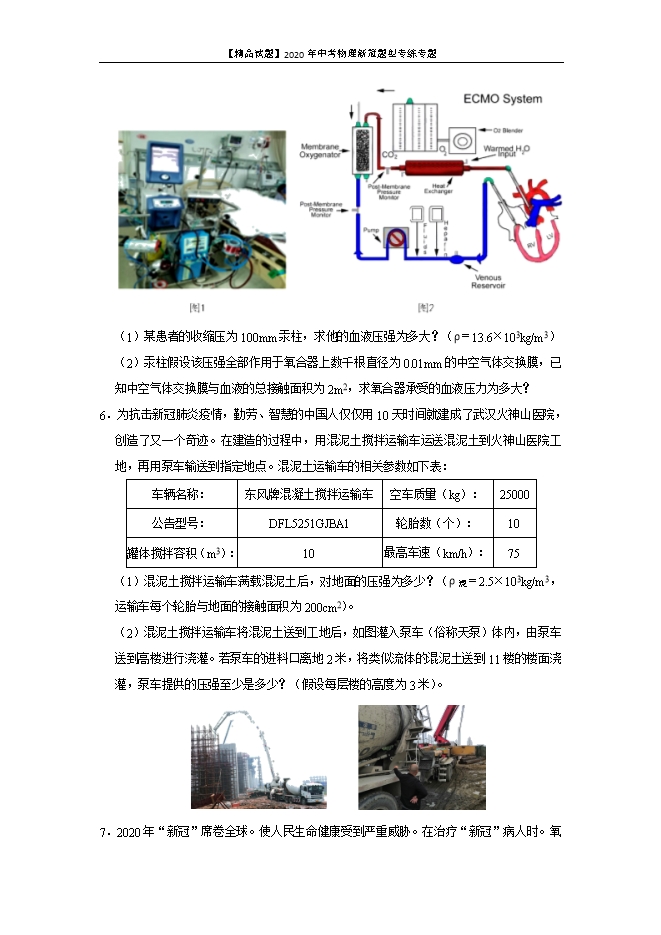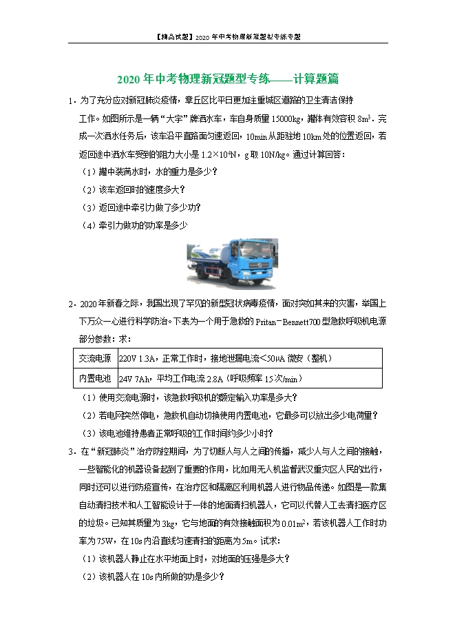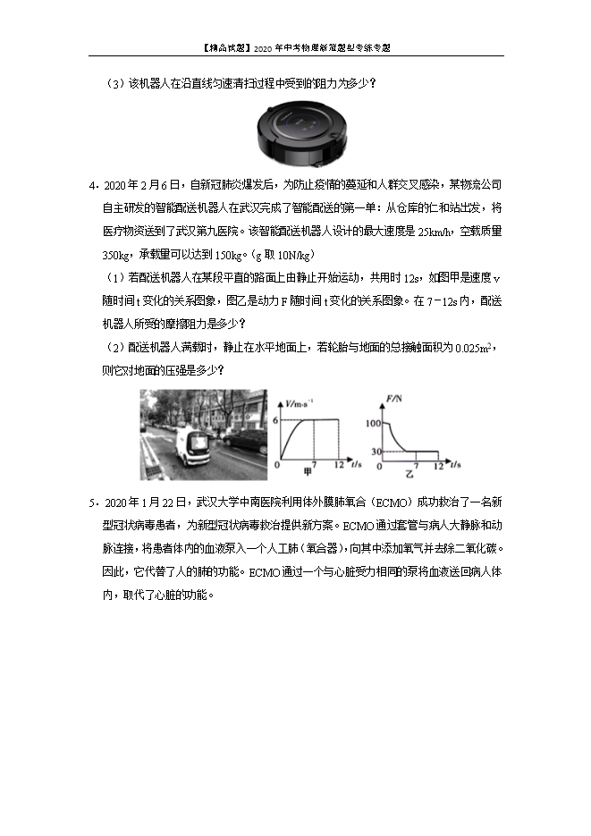 【内容简介】1.为了充分应对新冠肺炎疫情,章丘区比平日更加注重城区道路的卫生清洁保持工作。如图所示是一辆“大宇”牌洒水车,车自身质量15000kg,罐体有效容积8m3.完成一次洒水任务后,该车沿平直路面匀速返回,10min从距驻地10km处的位置返回,若返回途中洒水车受到的阻力大小是1.2×104N,g取10N/kg。通过计算回答:(1)罐中装满水时,水的重力是多少?(2)该车返回时的速度多大?(3)返回途中牵引力做了多少功?(4)牵引力做功的功率是多少 【解答】(1)罐中装满水时,水的体积等于罐体的有效容积,V水=V=8m3,由ρ= 可得,水的质量:m水=ρ水V水=1×103kg/m3×8m3=8000kg,水的重力:G水=m水g=8000kg×10N/kg=8×104N;(2)该车返回时的速度:v= = =60km/h;(3)因为汽车沿平直路面匀速返回,所以汽车受到的牵引力和阻力是一对平衡力,大小相等,汽车受到的牵引力:F=f=1.2×104N,返回途中牵引力做的功:W=Fs=1.2×104N×1×104m=1.2×108J;(4)牵引力做功的功率:P= = =2×105W。2.2020年新春之际,我国出现了罕见的新型冠状病毒疫情,面对突如其来的灾害,举国上下万众一心进行科学防治。下表为一个用于急救的Pritan﹣Bennett700型急救呼吸机电源部分参数:求:交流电源220V 1.3A,正常工作时,接地泄漏电流<50μA微安(整机)内置电池24V 7Ah,平均工作电流2.8A(呼吸频率15次/min)(1)使用交流电源时,该急救呼吸机的额定输入功率是多大?(2)若电网突然停电,急救机自动切换使用内置电池,它最多可以放出多少电荷量?(3)该电池维持患者正常呼吸的工作时间约多少小时?【解答】(1)根据表中数据可知,额定电压为220V,额定电流为1.3A,使用交流电源时,该急救呼吸机的额定输入功率:P=UI=220V×1.3A=286W;(2)根据表中数据可知,电池最多放出的电荷量:Q=7Ah=7A×3600s=2.52×104C;(3)该电池储存的电能:W=UQ=24V×2.52×104C=6.048×105J,由W=UIt可知,该电池维持患者正常呼吸的工作时间:t= = =9000s=2.5h。3.在“新冠肺炎”治疗防控期间,为了切断人与人之间的传播,减少人与人之间的接触,一些智能化的机器设备起到了重要的作用,比如用无人机监督武汉重灾区人民的出行,同时还可以进行防疫宣传,在治疗区和隔离区利用机器人进行物品传递。如图是一款集自动清扫技术和人工智能设计于一体的地面清扫机器人,它可以代替人工去清扫医疗区的垃圾。已知其质量为3kg,它与地面的有效接触面积为0.01m2,若该机器人工作时功率为75W,在10s内沿直线匀速清扫的距离为5m。试求:(1)该机器人静止在水平地面上时,对地面的压强是多大?(2)该机器人在10s内所做的功是多少?(3)该机器人在沿直线匀速清扫过程中受到的阻力为多少? 【解答】(1)该机器人静止在水平地面上时,对地面的压力:F=G=mg=3kg×10N/kg=30N,对地面的压强:p= = =3000Pa;(2)由P= 可得,该机器人在10s内所做的功:W=Pt=75W×10s=750J;(3)由W=Fs可得,该机器人在沿直线匀速清扫过程中的牵引力:F= = =150N,因该机器人在沿直线匀速清扫过程中处于平衡状态,受到的阻力和牵引力是一对平衡力,所以,在此过程中受到的阻力:f=F=150N。4.2020年2月6日,自新冠肺炎爆发后,为防止疫情的蔓延和人群交叉感染,某物流公司自主研发的智能配送机器人在武汉完成了智能配送的第一单:从仓库的仁和站出发,将医疗物资送到了武汉第九医院。该智能配送机器人设计的最大速度是25km/h,空载质量350kg,承载量可以达到150kg。(g取10N/kg)(1)若配送机器人在某段平直的路面上由静止开始运动,共用时12s,如图甲是速度v随时间t变化的关系图象,图乙是动力F随时间t变化的关系图象。在7﹣12s内,配送机器人所受的摩擦阻力是多少?(2)配送机器人满载时,静止在水平地面上,若轮胎与地面的总接触面积为0.025m2,则它对地面的压强是多少?