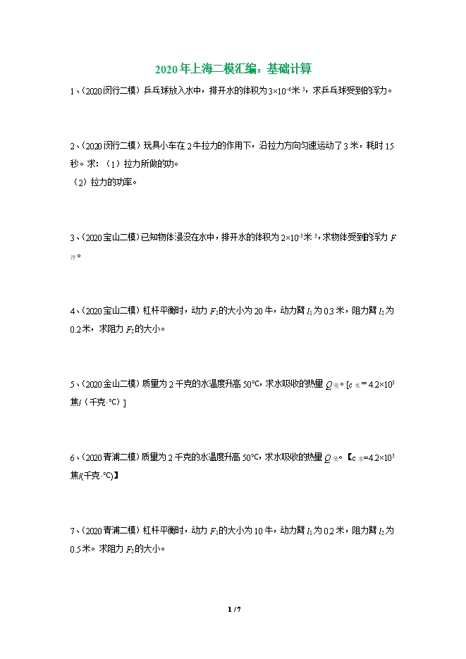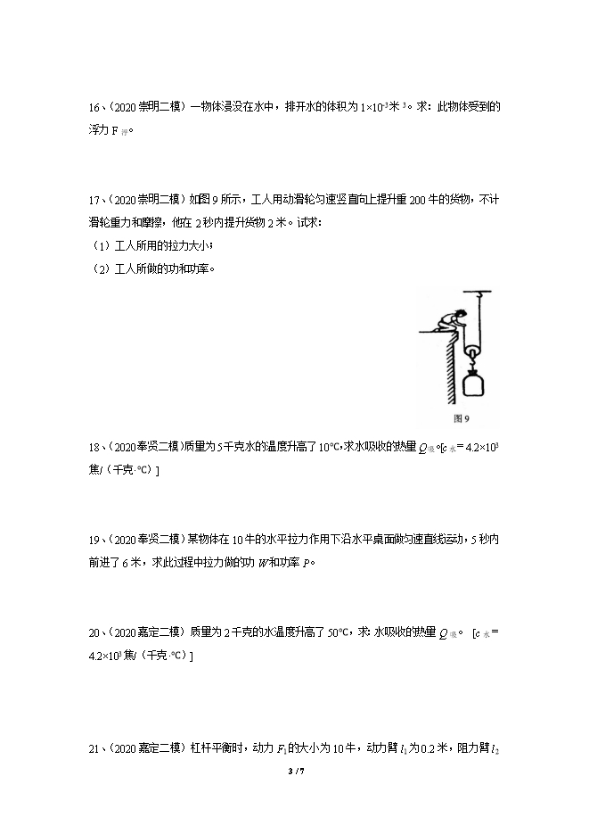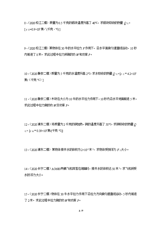 【内容简介】1、(2020闵行二模)乒乓球放入水中,排开水的体积为3×10-6米3,求乒乓球受到的浮力。2、(2020闵行二模)玩具小车在2牛拉力的作用下,沿拉力方向匀速运动了3米,耗时15秒。求:(1)拉力所做的功。(2)拉力的功率。3、(2020宝山二模)已知物体浸没在水中,排开水的体积为2×10-3米3,求物体受到的浮力F浮。4、(2020宝山二模)杠杆平衡时,动力F1的大小为20牛,动力臂l1为0.3米,阻力臂l2为0.2米,求阻力F2的大小。5、(2020金山二模)质量为2千克的水温度升高50℃,求水吸收的热量Q吸。[c水=4.2×103焦/(千克•℃)] 6、(2020青浦二模)质量为2千克的水温度升高50℃,求水吸收的热量Q吸。【c水=4.2×103焦/(千克•℃)】7、(2020青浦二模)杠杆平衡时,动力F1的大小为10牛,动力臂l1为0.2米,阻力臂l2为0.5米。求阻力F2的大小。8、(2020松江二模)质量为0.5千克的铝块温度升高了40℃,求铝块吸收的热量Q吸。[ c铝=0.9×103焦/(千克﹒℃) ]9、(2020松江二模)某物体在30牛的水平拉力F作用下,沿水平面做匀速直线运动,10秒内前进了8米。求此过程中拉力所做的功W和功率P。10、(2020静安二模)质量为5千克的水温度升高2℃,求水吸收的热量Q吸。[c水=4.2×103焦/(千克•℃)]11、(2020静安二模)木块在大小为10牛的水平拉力作用下,10秒内沿水平地面前进5米,求此过程中拉力做的功W及功率P。12、(2020浦东二模)将质量为2千克的铜加热,铜的温度升高了50℃,求铜吸收的热量Q吸。[c铜=0.39×103焦/(千克•℃)] 13、(2020浦东二模)某物体排开水的体积为2×10-3米3,求物体受到浮力F浮大小。14、(2020长宁二模)AG600两栖飞机降落在湖面时,排开水的体积达50米3,求飞机所受水的浮力大小。15、(2020长宁二模)物体在30牛水平拉力作用下沿拉力方向做匀速直线运动,5秒内前进了2米。求此过程中拉力做的功W和功率P。