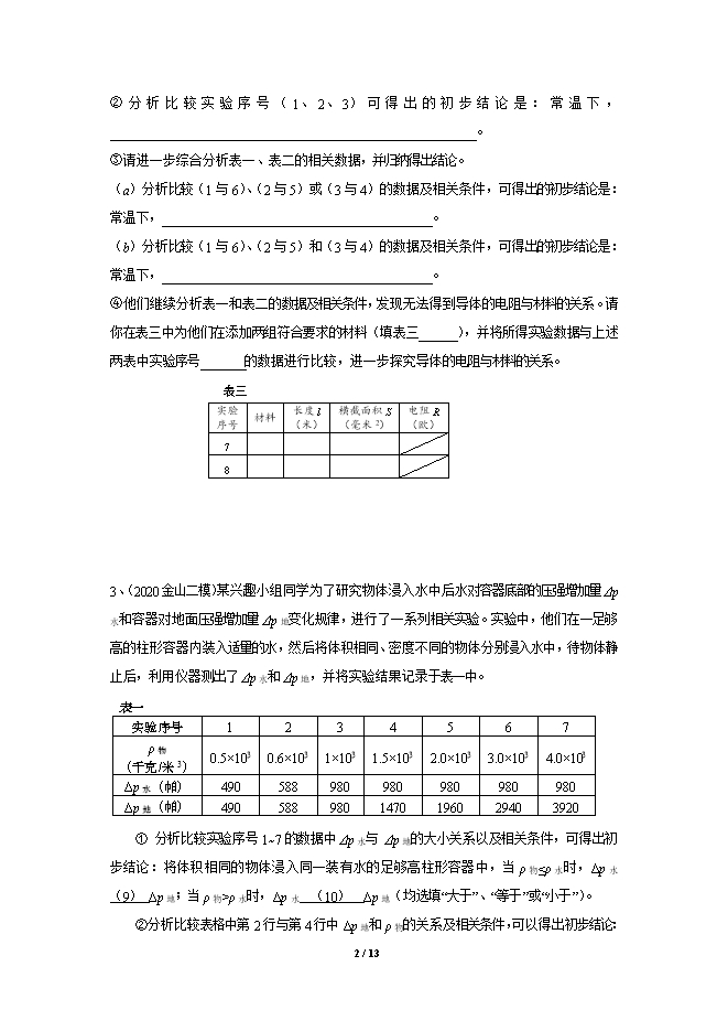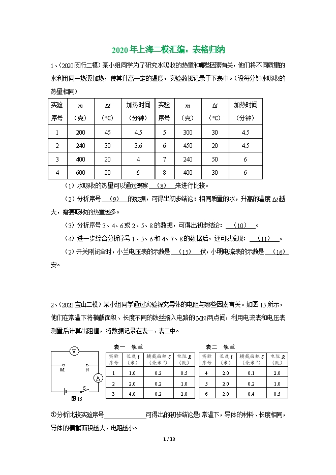 【内容简介】1、(2020闵行二模)某小组同学为了研究水吸收的热量和哪些因素有关,他们将不同质量的水利用同一热源加热,使其升高一定的温度,实验数据记录于下表中。(设每分钟水吸收的热量相同)实验序号m(克)Δt(℃)加热时间(分钟)实验序号m(克)Δt(℃)加热时间(分钟)1200454.55300304.52240303.66450204.53400204724050646002068400306(1)水吸收的热量可以通过观察 (8) 来进行比较。(2)分析序号 (9) 的数据,可得出初步结论:相同质量的水,升高的温度Δt越大,需要吸收的热量越多。(3)分析序号3、4、6或2、5、8的数据,可得出初步结论: (10) 。(4)进一步综合分析序号1、5、6和4、7、8的数据后,还可以发现: (11) 。(2)开关刚闭合时,小兰电压表的示数是 (15) 伏,小明电流表的示数是 (16) 安。2、(2020宝山二模)某小组同学通过实验探究导体的电阻与哪些因素有关。如图15所示,他们在常温下将横截面积、长度不同的铁丝接入电路的MN两点间,利用电流表和电压表测量后计算出阻值,将数据记录在表一、表二中。 ①分析比较实验序号______________可得出的初步结论是:常温下,导体的材料、长度相同,导体的横截面积越大,电阻越小。②分析比较实验序号(1、2、3)可得出的初步结论是:常温下,_________________________________________________________。③请进一步综合分析表一、表二的相关数据,并归纳得出结论。(a)分析比较(1与6)、(2与5)或(3与4)的数据及相关条件,可得出的初步结论是:常温下,__________________________________________。(b)分析比较(1与6)、(2与5)和(3与4)的数据及相关条件,可得出的初步结论是:常温下,__________________________________________。④他们继续分析表一和表二的数据及相关条件,发现无法得到导体的电阻与材料的关系。请你在表三中为他们在添加两组符合要求的材料(填表三______),并将所得实验数据与上述两表中实验序号_______的数据进行比较,进一步探究导体的电阻与材料的关系。3、(2020金山二模)某兴趣小组同学为了研究物体浸入水中后水对容器底部的压强增加量Δp水和容器对地面压强增加量Δp地变化规律,进行了一系列相关实验。实验中,他们在一足够高的柱形容器内装入适量的水,然后将体积相同、密度不同的物体分别浸入水中,待物体静止后,利用仪器测出了Δp水和Δp地,并将实验结果记录于表一中。 ① 分析比较实验序号1~7的数据中Δp水与 Δp地的大小关系以及相关条件,可得出初步结论:将体积相同的物体浸入同一装有水的足够高柱形容器中,当ρ物≤ρ水时,Δp水 (9) Δp地;当ρ物˃ρ水时,Δp水 (10) Δp地(均选填“大于”、“等于”或“小于”)。②分析比较表格中第2行与第4行中Δp地和ρ物的关系及相关条件,可以得出初步结论: (11) 。③ 由实验序号4、5或6的数据及相关条件,发现当ρ物˃ρ水时,ρ物、ρ水、Δp水 和Δp地满足一定的关系。若换用另一物体做进一步实验探究,请在表二实验序号8中填入相应的实验数据。