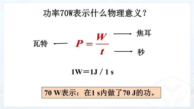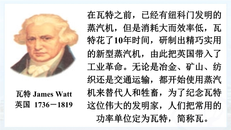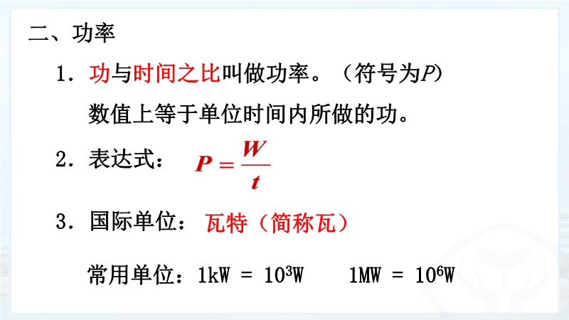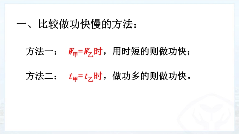 【内容简介】一、比较做功快慢的方法方法一: W甲=W乙时,用时短的则做功快;方法二: t甲=t乙时,做功多的则做功快。二、功率1.功与时间之比叫做功率。(符号为P)数值上等于单位时间内所做的功。