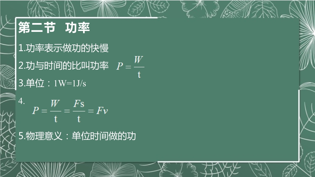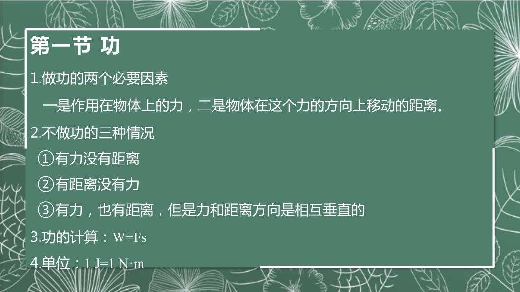 【内容简介】第一节 功1.做功的两个必要因素 一是作用在物体上的力,二是物体在这个力的方向上移动的距离。2.不做功的三种情况 ①有力没有距离 ②有距离没有力 ③有力,也有距离,但是力和距离方向是相互垂直的3.功的计算:W=Fs4.单位:1 J=1 N·m第二节 功率1.功率表示做功的快慢2.功与时间的比叫功率3.单位:1W=1J/s4.5.物理意义:单位时间做的功