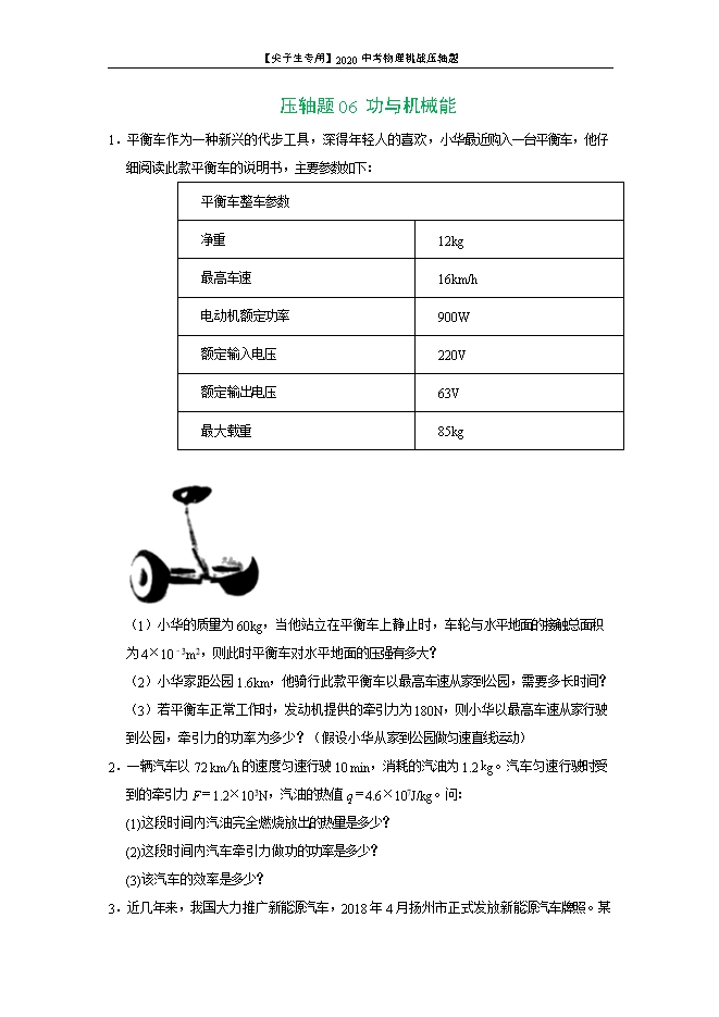 【内容简介】1.平衡车作为一种新兴的代步工具,深得年轻人的喜欢,小华最近购入一台平衡车,他仔细阅读此款平衡车的说明书,主要参数如下:平衡车整车参数净重12kg最高车速16km/h电动机额定功率900W额定输入电压220V额定输出电压63V最大载重85kg (1)小华的质量为60kg,当他站立在平衡车上静止时,车轮与水平地面的接触总面积为4×10﹣3m2,则此时平衡车对水平地面的压强有多大?(2)小华家距公园1.6km,他骑行此款平衡车以最高车速从家到公园,需要多长时间?(3)若平衡车正常工作时,发动机提供的牵引力为180N,则小华以最高车速从家行驶到公园,牵引力的功率为多少?(假设小华从家到公园做匀速直线运动)【答案】(1)1.8×105Pa;(2)0.1h;(3)800W。【解析】【详解】(1).该车静止时对水平地面的压力:F=G总=(m1+m2)g=(60kg+12kg)×10N/kg=720N,对水平地面的压强: ;(2).由 可得,以最高车速从家到公园,需要的时间: ;(3).最高车速: ,牵引力的功率: 。答:(1).此时平衡车对水平地面的压强有1.8×105Pa;(2).他骑行此款平衡车以最高车速从家到公园,需要0.1h时间;(3).牵引力的功率为800W。2.一辆汽车以72 km/h的速度匀速行驶10 min,消耗的汽油为1.2 kg。汽车匀速行驶时受到的牵引力F=1.2×103N,汽油的热值q=4.6×107J/kg。问:(1)这段时间内汽油完全燃烧放出的热量是多少?(2)这段时间内汽车牵引力做功的功率是多少?(3)该汽车的效率是多少?【答案】(1)5.52×107J;(2)2.4×104W;(3)26%【解析】【详解】(1)汽油完全燃烧放出的热量: (2)汽车的速度v=72 km/h=20 m/s汽车牵引力做功的功率: (3)在测试时间内汽车的有用功: 在测试时间内该汽车的效率: 答:(1)汽油完全燃烧放出的热量是5.52×107J;(2)汽车牵引力做功的功率是2.4×104W;(3)汽车的效率是26%。3.近几年来,我国大力推广新能源汽车,2018年4月扬州市正式发放新能源汽车牌照。某款电动汽车(如图所示)以60 km/h的速度匀速行驶了80 km,所受的牵引力为720 N,耗电18 kW•h,请解答下列问题: (1)牵引力所做的功是多少?(2)牵引力的功率是多少?(3)上述行驶过程中,电动车的效率是多少?【答案】(1)5.76×107J;(2)1.2×104w;(3)88.9%【解析】【分析】【详解】(1)牵引力所做的功是