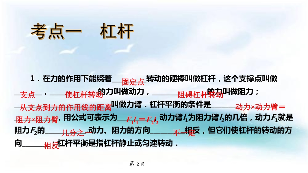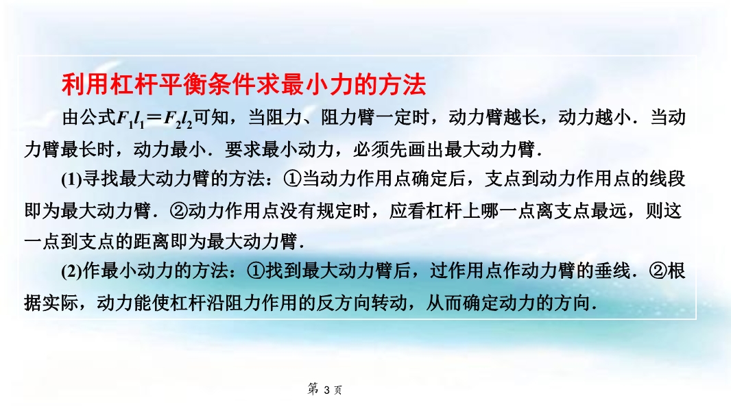 【内容简介】考点一 杠杆1.在力的作用下能绕着__________转动的硬棒叫做杠杆,这个支撑点叫做________,______________的力叫做动力,________________的力叫做阻力;____________________________叫做力臂.杠杆平衡的条件是__________________ ____________,用公式可表示为__________,动力臂l1为阻力臂l2的几倍,动力F1就是阻力F2的____________.动力、阻力的方向__________相反,但它们使杠杆的转动的方向________;杠杆平衡是指杠杆静止或匀速转动.利用杠杆平衡条件求最小力的方法由公式F1l1=F2l2可知,当阻力、阻力臂一定时,动力臂越长,动力越小.当动力臂最长时,动力最小.要求最小动力,必须先画出最大动力臂.(1)寻找最大动力臂的方法:①当动力作用点确定后,支点到动力作用点的线段即为最大动力臂.②动力作用点没有规定时,应看杠杆上哪一点离支点最远,则这一点到支点的距离即为最大动力臂.(2)作最小动力的方法:①找到最大动力臂后,过作用点作动力臂的垂线.②根据实际,动力能使杠杆沿阻力作用的反方向转动,从而确定动力的方向.