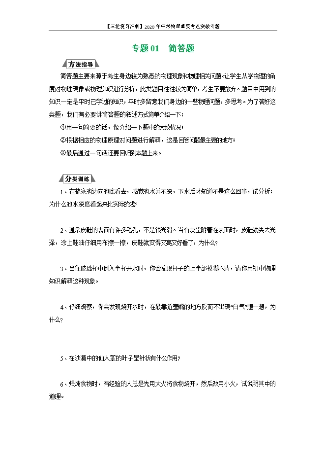 【三轮复习冲刺】2020年中考物理重要考点突破专题:01 简答题(原卷版和解析版)