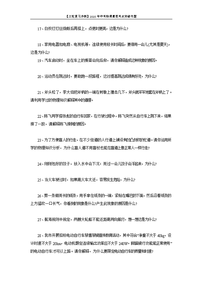 【内容简介】简答题主要来源于考生身边较为熟悉的物理现象和物理相关问题。让学生从学物理的角度对物理现象或物理知识进行分析,此类题目往往较为简单,考生不要放弃。题目中用到的知识一定是平时已学过的知识,平时多留意我们身边的一些物理问题,多思考。为了答好这类题,我们有必要讲简答题的叙述方式简单介绍一下:①用一句简要的话,像介绍一下题中的大致情况;②根据相应的物理原理对问题进行解释,这是回答问题最主要的地方;③最后通过一句话还要回归到本题上来。1、在游泳池边向池底看去,感觉池水并不深,下水后才知道不是这么回事,试分析:为什么池水深度看起来比实际的浅?【答案】光从一种介质斜射入另一种介质时要发生折射,人从空气看河底,实际看到的是河底的虚像,虚像的位置比实际河底的位置浅。2、通常皮鞋的表面有许多毛孔,不是很光滑。当有灰尘附着在表面时,皮鞋就失去光泽,涂上鞋油仔细用布擦一擦,皮鞋就变得又亮又好看了,为什么?【答案】因为皮鞋的表面不光滑有灰尘,光射向鞋面后发生漫反射,这样皮鞋就失去了光泽,涂上鞋油后,鞋油的微小颗粒能填充到鞋的毛孔中,用布仔细擦试,使鞋油涂抹得更均匀,鞋面就变得十分光滑,光射向鞋面后会发生镜面反射,皮鞋看起来就更光亮更好看了。3、当往玻璃杯中倒入半杯开水时,你会发现杯子的上半部模糊不清,请你用初中物理知识解释这种现象。【答案】往玻璃杯中倒入半杯开水时,开水蒸发产生水蒸气。高温水蒸气遇到温度较低的玻璃内壁就液化成小水珠,并附在玻璃内壁上,所以杯子的上半部模糊不清。4、仔细观察,你会发现烧开水时,在最靠近壶嘴的地方反而不出现“白气”想一想,为什么?【答案】那是因为靠近壶嘴的地方温度高,从壶嘴出来的是水蒸气,而水蒸气是肉眼看不到的。而那些看得到的"白气"是水蒸气遇冷而液化了,成了液态的小水珠,所以看得见。5、在沙漠中的仙人掌的叶子呈针状有什么作用?【答案】沙漠中的仙人掌的针状叶子减小了表面积,可防止体内水分蒸发过快,有利于仙人掌在沙漠中的生存.6、煨炖食物时,有经验的人总是先用大火将食物烧开,然后改用小火,试说明其中的道理。【答案】先用大火可以将水迅速烧开,达到相对最高的温度沸点,继续加热水的温度不变,但是要保持水持续沸腾,要持续加热,调小火,是为了维持水沸腾,让水温保持最高,及可以使食物熟得快,也可以节能。7、医生给病人检查时,常把一把小镜子在酒精灯上烧一烧,然后再放入病人的口腔,为什么?【答案】这样做的目的是提高小镜子的温度,避免口腔中的水蒸气在镜面上遇冷而液化成小水珠附着在镜面上,使平面镜成像模糊.8、舞台上经常用喷洒干冰(固体二氧化碳)的方法制造白雾以渲染气氛,你知道其中的道理吗?【答案】干冰是固态二氧化碳,在空气中干冰升华使周围的环境温度降低,使其中的水蒸气遇冷液化成小水珠,就形成了白雾。9、农谚说“霜前冷,雪后寒”,你认为这一说法有道理吗?为什么?【答案】霜是空气中的水蒸汽凝华形成的,凝华放热,所以形成之前天气很冷,这样才满足降霜的条件。雪是水凝固形成的,凝固放热,所以正下雪时,感觉不是太冷,而雪熔化或升华都要吸热,所以雪后感觉更冷。10、水稻是喜温作物,在每年的三四月份育秧时,为了防止霜冻,傍晚常常在秧田里灌灌满水为什么?【答案】由于水的比热容大,水温降低一定值时,会放出很多热量,这样就保证了环境的温度不至于降低的太低,以防止稻苗冻伤。11、夏天游泳后从游泳池中走出,风一吹感到很凉,为什么?【答案】从游泳池出来时身体上有残留水分,有风吹过时,会加快水分的蒸发,而水的蒸发需要吸热,便从人体表面吸收大量的热量,于是人的体表温度降低,人就会觉得凉。12、用打气筒给自行车打气,打完后摸一摸打气筒的外壁,发现外壁发热了,为什么?【答案】打气时,活塞压缩气体做功,使气体的内能增大,温度升高,通过热传递也使气筒外壁变热。另一方面活塞筒壁上下摩擦,机械能转化为内能,使气筒外壁变热。