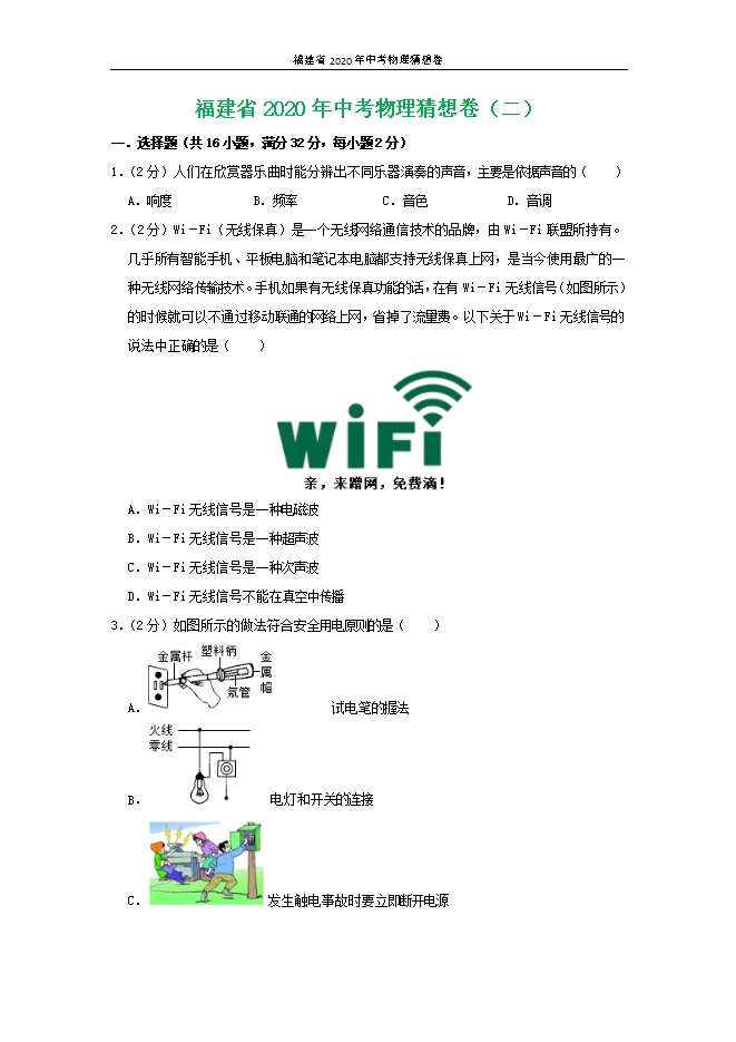 【内容简介】一.选择题(共16小题,满分32分,每小题2分)1.(2分)人们在欣赏器乐曲时能分辨出不同乐器演奏的声音,主要是依据声音的( )A.响度B.频率C.音色D.音调【答案】C【解析】不同的乐器演秦乐曲,发出的音色也不相同,故可用音色来辨别。故选:C。2.(2分)Wi﹣Fi(无线保真)是一个无线网络通信技术的品牌,由Wi﹣Fi联盟所持有。几乎所有智能手机、平板电脑和笔记本电脑都支持无线保真上网,是当今使用最广的一种无线网络传输技术。手机如果有无线保真功能的话,在有Wi﹣Fi无线信号(如图所示)的时候就可以不通过移动联通的网络上网,省掉了流量费。以下关于Wi﹣Fi无线信号的说法中正确的是( ) A.Wi﹣Fi无线信号是一种电磁波B.Wi﹣Fi无线信号是一种超声波C.Wi﹣Fi无线信号是一种次声波D.Wi﹣Fi无线信号不能在真空中传播【答案】A【解析】Wi﹣Fi无线信号是一种电磁波,是利用电磁波进行信息传输的,电磁波能在真空中传播。故BCD错误、A正确。故选:A。3.(2分)如图所示的做法符合安全用电原则的是( )A. 试电笔的握法B. 电灯和开关的连接C. 发生触电事故时要立即断开电源D. 多个大功率用电器同时使用一个插座【答案】C【解析】A、图中人手没有接触测电笔笔尾的金属体,这种使用方法是错误的;B、接灯时,火线首先接入开关,然后进入灯泡顶端的金属点;零线直接进入灯泡的螺旋套。开关要接在灯泡和火线之间,断开开关,切断火线,触及灯泡时更安全,该选项连接错误;C、发现有人触电,首先要使触电者尽快脱离电源,然后根据具体情况,进行相应的救治,如果用手将触电者拉开,这样就会使救人者间接接触带电体而触电,十分危险,此选项做法正确;D、当家庭电路中接入多个大功率的用电器时,会使得干路中的电流变大,超过电路的负荷而发生危险,该选项做法是错误的。故选:C。......