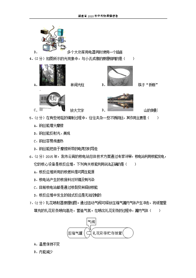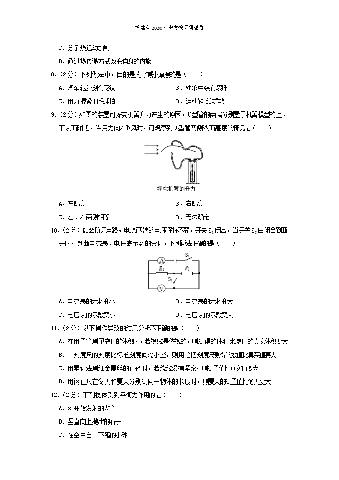 福建省2020年中考物理猜想卷(二)(原卷版和解析版)