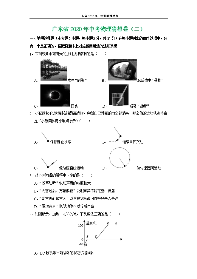 【内容简介】一、单项选择题(本大题7小题,每小题3分,共21分)在每小题列出的四个选项中,只有一个是正确的,请把答题卡上对应题目所选的选项涂黑1.下列现象中可用光的折射规律解释的是( )A. 水中“倒影”B. 观后镜中“景物”C. 日食D. 铅笔“折断”【答案】D【解析】A、水中“倒影”是平面镜成像,平面镜成像是利用光的反射原理,故A不符合题意;B、观后镜中“景物”是平面镜成像,平面镜成像是利用光的反射原理,故B不符合题意;C、日食形成是利用了光沿直线传播的原理,故C不符合题意;D、玻璃杯中“折断”的铅笔,这是光的折射现象,故D符合题意;选D。2.小聪荡秋千运动到右端最高点时,突然自己受到的力全部消失,那么他的运动轨迹将会是(小聪同学用小黑点表示)( )A. 保持静止状态B. 继续来回摆动C. 做匀速直线运动D. 做匀速圆周运动【答案】A【解析】当自己荡秋千运动到右端最高点时,此时重力势能最大,物体速度为零,所以此时处于静止状态,若受到的力全部消失,根据牛顿第一定律可知,仍保持静止。选A。3.对下列词语的解释中正确的是( )A.“悦耳动听”说明声音的响度较大......