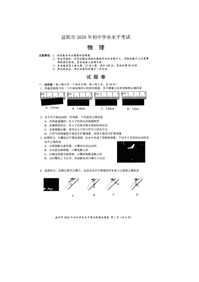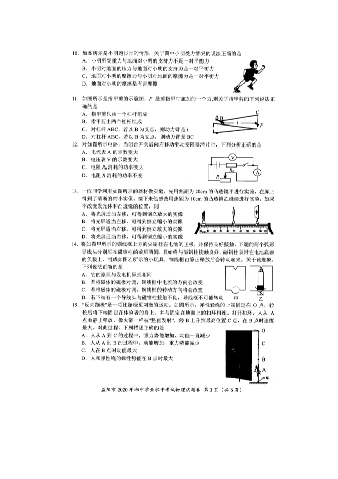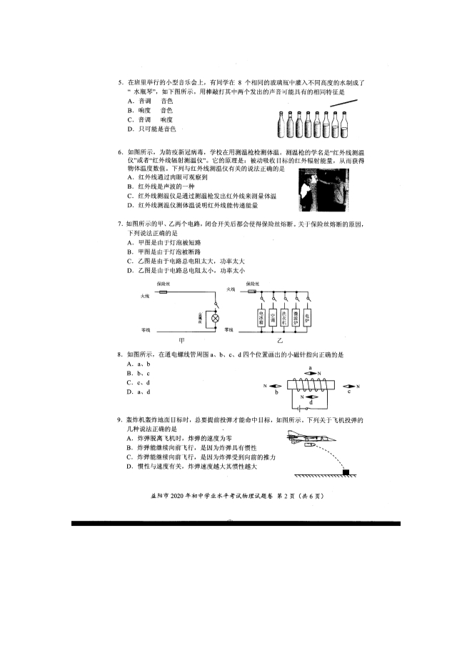 2020年湖南省益阳市初中学业水平考试物理试题及答案(图片版)