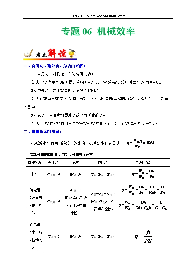 【精品】中考物理必考计算精解精练专题:06 机械效率 专题计算(原卷版和解析版)