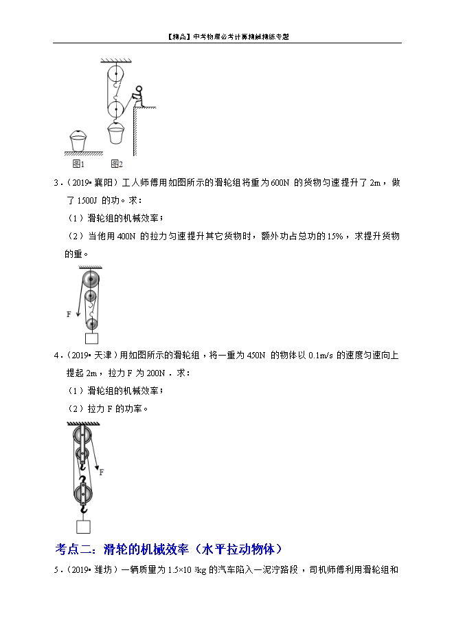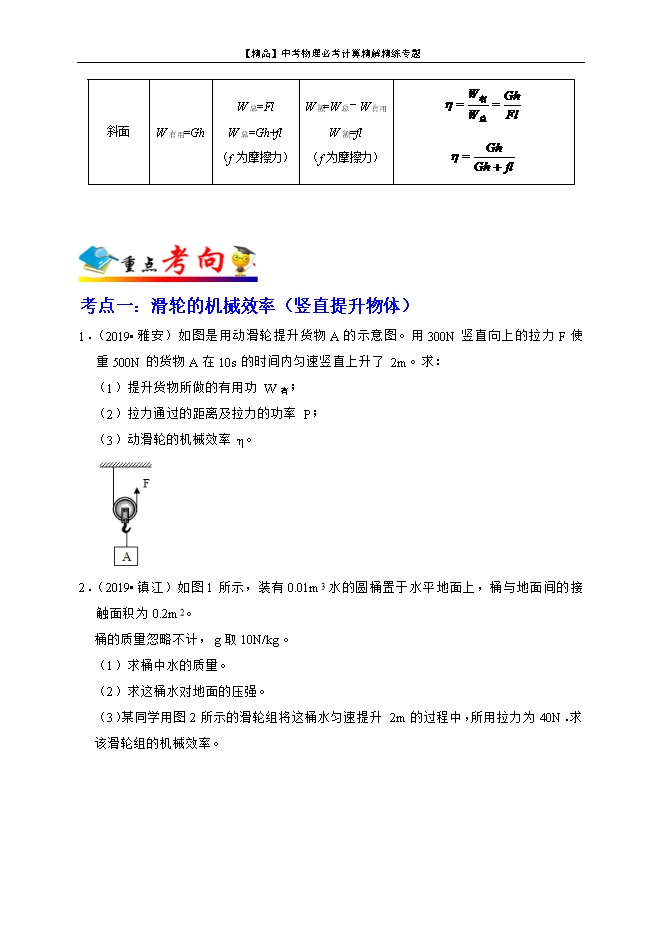 【内容简介】一、有用功、额外功、总功的求解:1、有用功:对机械、活动有用的功。公式:W有用=Gh(提升重物)=W总-W额=ηW总;斜面:W有用= Gh。2、额外功:并非需要但又不得不做的功。公式:W额= W总-W有用=G动h(忽略轮轴摩擦的动滑轮、滑轮组);斜面: W额=fL。3、总功:有用功加额外功或动力所做的功。公式: W总=W有用+W额=FS= W有用/η;斜面:W总= fL+Gh=FL。二、机械效率的求解:机械效率:有用功跟总功的比值。机械效率计算公式: 常考机械的有用功、总功、机械效率计算简单机械有用功总功额外功机械效率杠杆W有用=GhW总=FsW额=W总-W有用 滑轮组(竖直方向提升物体)W有用=GhW总=FsW总=Gh+G动h(不计绳重和摩擦)W额=W总-W有用W额=G动h(不计绳重和摩擦) 滑轮组(水平方向拉动物体)W有用=flW总=FsW额=W总-W有用 斜面W有用=GhW总=FlW总=Gh+fl(f为摩擦力)W额=W总-W有用W额=fl(f为摩擦力) 考点一:滑轮的机械效率(竖直提升物体)1.(2019•雅安)如图是用动滑轮提升货物A的示意图。用300N竖直向上的拉力F使重500N的货物A在10s的时间内匀速竖直上升了2m。求:(1)提升货物所做的有用功W有;(2)拉力通过的距离及拉力的功率P;(3)动滑轮的机械效率η。 【解析】解:(1)提升货物所做的有用功:W有用=Gh=500N×2m=1000J;(2)使用动滑轮时,n=2,拉力端通过的距离:s=2h=2×2m=4m,拉力F做的总功:W总=Fs=300N×4m=1200J;拉力做功的功率:P= = =120W;(3)动滑轮的机械效率:η= = ×100%≈83.3%。答:(1)提升货物所做的有用功为1000J;(2)拉力通过的距离、拉力的功率分别为4m、120W;(3)动滑轮的机械效率为83.3%。2.(2019•镇江)如图1所示,装有0.01m3水的圆桶置于水平地面上,桶与地面间的接触面积为0.2m2。桶的质量忽略不计,g取10N/kg。(1)求桶中水的质量。(2)求这桶水对地面的压强。(3)某同学用图2所示的滑轮组将这桶水匀速提升2m的过程中,所用拉力为40N.求该滑轮组的机械效率。 【解析】解:(1)水的体积V=0.01m3,由ρ= 可得水的质量:m=ρV=1×103kg/m3×0.01m3=10kg;(2)这桶水所受的重力:G=mg=10kg×10N/kg=100N,桶的质量忽略不计、自重不计,则水桶对地面的压力:F=G=100N,这桶水对地面的压强:p= = =500Pa;(3)由图知,承担物重的绳子股数n=3,则滑轮组的机械效率:η= = = = = ×100%≈83.3%。答:(1)这桶水的质量为10kg。(2)桶对地面的压强为500Pa。(3)滑轮组的机械效率为83.3%。3.(2019•襄阳)工人师傅用如图所示的滑轮组将重为600N的货物匀速提升了2m,做了1500J的功。求:(1)滑轮组的机械效率;(2)当他用400N的拉力匀速提升其它货物时,额外功占总功的15%,求提升货物的重。 【解析】解:(1)所做的有用功:W有用=Gh=600N×2m=1200J,由题知,工人做了1500J的功,即W总=1500J,滑轮组的机械效率:η= = ×100%=80%;(2)当他用400N的拉力匀速提升其它货物时,额外功占总功的15%,则有用功占总功的为85%,即η′=85%,由图知,n=3,滑轮组的机械效率η′= = = = ,所以,此时提升的物重: