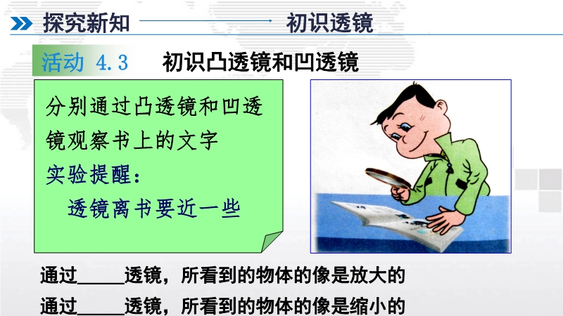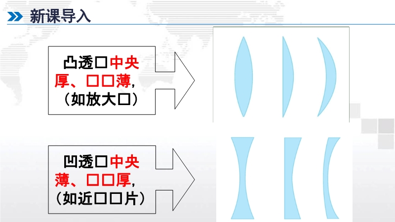 【内容简介】凸透镜中央厚、边缘薄,(如放大镜)凹透镜中央薄、边缘厚,(如近视镜片)初识凸透镜和凹透镜分别通过凸透镜和凹透镜观察书上的文字实验提醒: 透镜离书要近一些........