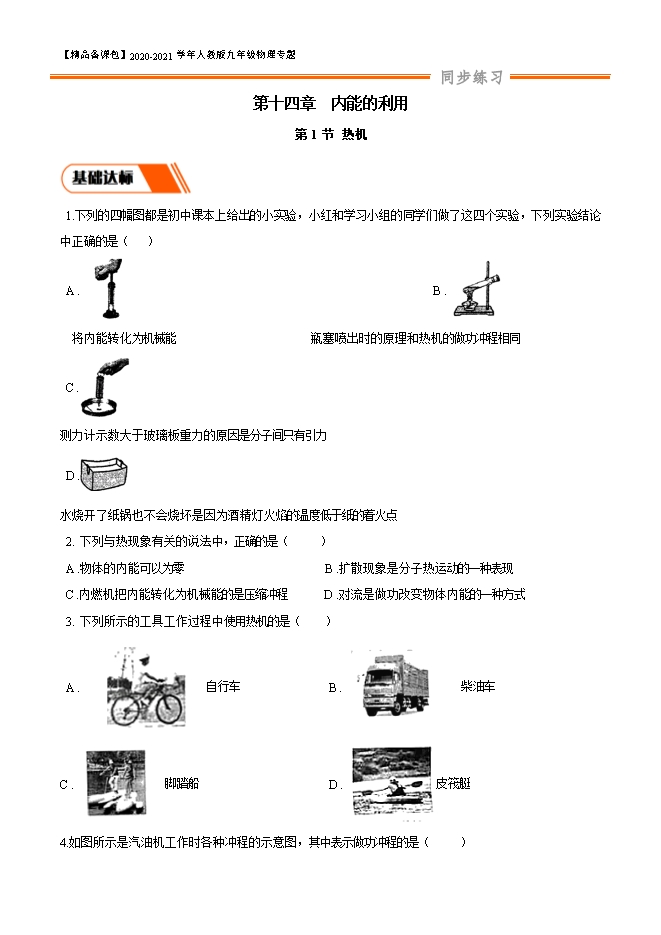 - 672023-2024人教版九年级物理同步练:《14.1热机》同步练1(附答案)