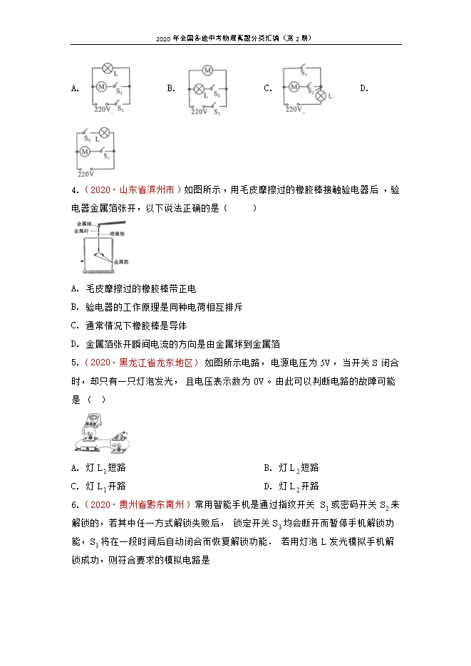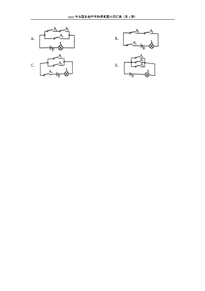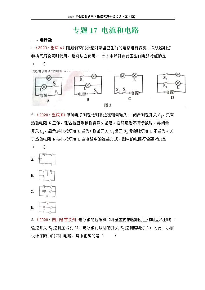 【内容简介】一、选择题1.(2020•重庆A)刚搬新家的小超对家里卫生间的电路进行探究,发现照明灯和换气扇能同时使用,也能独立使用,图3中最符合此卫生间电路特点的是( ) 答案:D解析:文中提到照明灯和换气扇既能用时使用也能独立使用,即照明灯和换气扇为并联电路,开关分别控制它们,故选D。2.(2020•重庆B)某种电子测温枪测靠近被测者额头,闭合测温开关S1,只有热敏电阻R工作,测温枪显示被测者额头温度。在环境看不清示数时,再闭合开关S2,显示屏补光灯泡L发光;测温开关S1断开S2闭合时灯泡L不发光。关于热敏电阻R与补光灯泡L在电路中的连接方式,图中的电路符合要求的是( )A. B. C. D. 【答案】D【解析】【详解】由题意可知,同时闭合开关S2和S1时,补光灯泡L发光;补光灯泡L不发光时热敏电阻也能正常工作,说明补光灯泡与热敏电阻并联,图中的电路符合要求的是D选项的电路图。故选D。3.(2020•四川省甘孜州)电冰箱的压缩机和冷藏室内的照明灯工作时互不影响,温控开关S1控制压缩机M,与冰箱门联动的开关S2控制照明灯L。为此,小丽设计了图中的四种电路,其中正确的是( )A. B. C. D. 【答案】D【解析】【详解】A.要使电冰箱的压缩机和冷藏室内的照明灯工作时互不影响,则电路设计时要让压缩机M和照明灯L并联,并且温控开关S1串联在压缩机M支路,与冰箱门联动的开关S2串联在照明灯L支路,故A错误;B.要使电冰箱的压缩机和冷藏室内的照明灯工作时互不影响,则电路设计时要让压缩机M和照明灯L并联,并且温控开关S1串联在压缩机M支路,与冰箱门联动的开关S2串联在照明灯L支路,故B错误;C.要使电冰箱的压缩机和冷藏室内的照明灯工作时互不影响,则电路设计时要让压缩机M和照明灯L并联,并且温控开关S1串联在压缩机M支路,与冰箱门联动的开关S2串联在照明灯L支路,故C错误;D.要使电冰箱的压缩机和冷藏室内的照明灯工作时互不影响,则电路设计时要让压缩机M和照明灯L并联,并且温控开关S1串联在压缩机M支路,与冰箱门联动的开关S2串联在照明灯L支路,故D正确。故选D。