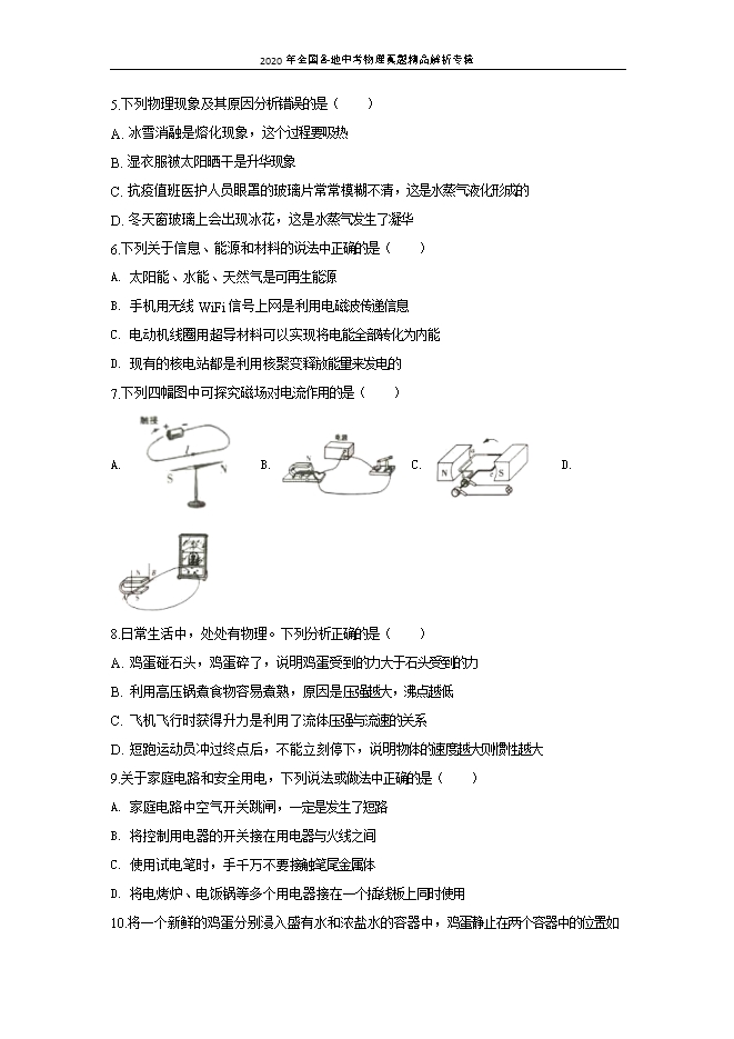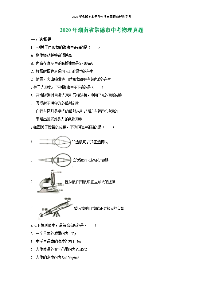 【内容简介】一、选择题1.下列关于声现象的说法中正确的是( )A. 物体振动越快音调越高B. 声音在真空中的传播速度是3×108m/sC. 打雷时捂住耳朵可以防止雷声的产生D. 地震、火山喷发等自然现象都伴有超声波的产生【答案】A【解析】【详解】A.音调是由物体振动的快慢,即频率决定的,物体振动的频率越快,音调越高,故A正确;B.声音不能在真空中传播,故B错误;C.打雷时捂住耳朵可以减弱进入耳朵的声音,不能防止雷声的产生,故C错误;D.地震、火山喷发等自然现象都伴有次声波产生,故D正确。故选A。2.关于光现象,下列说法中不正确的是( )A. 开凿隧道时用激光束引导掘进机,利用了光的直线传播B. 漫反射不遵守光的反射定律C. 自行车尾灯是靠光的反射来引起后方车辆司机注意的D. 雨后出现彩虹是光的色散现象【答案】B【解析】【详解】A.利用光的直线传播来进行激光准直,从而开凿出平直的隧道,故A正确,不符合题意;B.镜面反射和漫反射都遵循光的反射定律,故B错误,符合题意;C.自行车尾灯本身是不发光的,靠反射后车灯的光线来引起后车司机的注意,故C正确,不符合题意;D.雨后彩虹是光的色散形成的七色光,故D正确,不符合题意。故选B。3.如图关于透镜的应用,下列说法中正确的是( )A. 凹透镜可以矫正远视眼B. 凸透镜可以矫正近视眼C. 显做镜的目镜成正立放大的虚像D. 望远镜的目镜成正立放大的实像【答案】C【解析】【详解】A.凹透镜可以矫正近视眼,故A错误;B.凸透镜可以矫正远视眼,故B错误;C.显做镜的目镜成正立放大的虚像,故C正确;D.望远镜的目镜成正立放大的虚像,故D错误。故选C。4.以下估测值中,最符合实际的是( )A. 一个苹果的质量约为150gB. 中学生课桌的高度约为1.5mC. 人体体温的变化范围约为0~42℃D. 人体的密度约为8×103kg/m3【答案】A【解析】【详解】A.六个苹果的质量一般为1kg,则一个苹果的质量约为150g,故A符合实际;B.中学生课桌的高度约为1m,故B不符合实际;C.人体正常体温为37℃,而体温计的刻度范围通常为35~42℃,故C不符合实际;D.人体的密度与水的密度相近,即约为1.0×103kg/m3,故D不符合实际。故选A。5.下列物理现象及其原因分析错误的是( )A. 冰雪消融是熔化现象,这个过程要吸热B. 湿衣服被太阳晒干是升华现象C. 抗疫值班医护人员眼罩的玻璃片常常模糊不清,这是水蒸气液化形成的D. 冬天窗玻璃上会出现冰花,这是水蒸气发生了凝华【答案】B【解析】【详解】A.冰雪消融,是固体变为液体,是熔化现象,熔化过程是吸热的,故A正确,A不符合题意;B.湿衣服被太阳晒干是液体变为气体,是汽化现象,故B错误,B符合题意;C.抗疫值班医护人员眼罩的玻璃片常常模糊不清,是水蒸气遇冷液化成的小液滴附着在玻璃片上,故C正确,C不符合题意;D.冬天窗玻璃上会出现冰花是水蒸气遇冷直接凝华成的固体冰花,故D正确,D不符合题意。故选B。6.下列关于信息、能源和材料的说法中正确的是( )A. 太阳能、水能、天然气是可再生能源B. 手机用无线WiFi信号上网是利用电磁波传递信息C. 电动机线圈用超导材料可以实现将电能全部转化为内能D. 现有的核电站都是利用核聚变释放能量来发电的【答案】B【解析】【详解】A.太阳能、水能 可再生能源,天然气是不可再生能源,故A错误;B.手机用无线WiFi信号上网时传输的文字、图片都是经过电信号转换的,是利用电磁波传递信息,故B正确;C.线圈用超导材料可以实现将电能全部转化为内能,但是电动机工作时是将电能转化为机械能, 故C错误;D.现有的核电站都是利用可控的核裂变释放能量来发电的,故D错误。故选B。