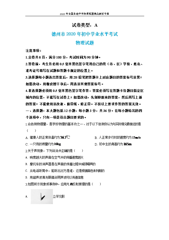2020年全国各地中考物理真题精品解析专辑:山东德州卷(word解析版和原卷版)