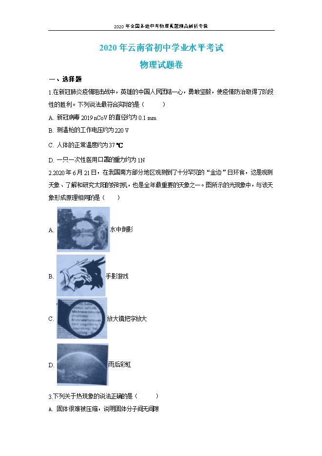 2020年全国各地中考物理真题精品解析专辑:云南卷(word解析版和原卷版)