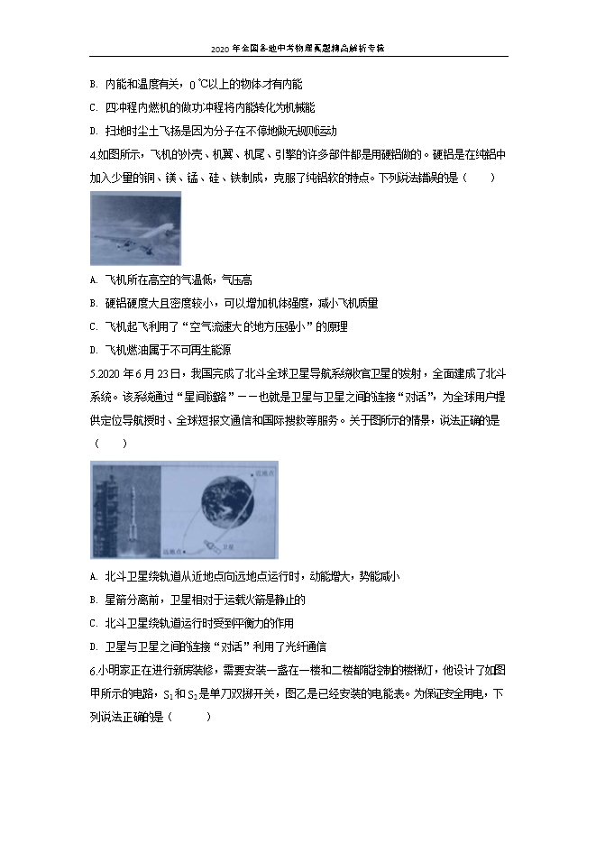 【内容简介】1.在新冠肺炎疫情阻击战中,英雄的中国人民团结一心,勇敢坚毅,使疫情防治取得了阶段性的胜利。下列说法最符合实际的是( )A. 新冠病毒2019 nCoV的直径约为0.1 mmB. 测温枪 工作电压约为220 VC. 人体的正常温度约为37 D. 一只一次性医用口罩的重力约为1N【答案】C【解析】【详解】A.新冠病毒2019 nCoV的直径约为30到450nm,故A不符合实际;B.测温枪的工作电池为两节5号串联,故工作电压为3V,故B不符合实际;C.人体的正常温度约为37 ,故C符合实际;D.一只一次性医用口罩的质量约10g左右,重力约为0.1N,故D不符合实际。故选C。2.2020年6月21日,在我国南方部分地区观测到了十分罕见的“金边”日环食,这是观测天象、了解和研究太阳的好时机,也是全年最重要的天象之一。图所示的光现象中,与该天象形成原理相同的是( )A. 水中倒影B. 手影游戏C. 放大镜把字放大D. 雨后彩虹【答案】B【解析】【详解】A.日环食的形成是因为光沿直线传播,而水中倒影是因为光发生了反射,故A不符合题意;B.手影游戏是影子的形成,原因是光沿直线传播,故B符合题意;C.放大镜把字放大是因为光发生了折射,故C不符合题意;D.雨后彩虹是因为光发生了折射,故D不符合题意。故选B 3.下列关于热现象的说法正确的是( )A. 固体很难被压缩,说明固体分子间无间隙B. 内能和温度有关,0 ℃以上的物体才有内能C. 四冲程内燃机的做功冲程将内能转化为机械能D. 扫地时尘土飞扬是因为分子在不停地做无规则运动【答案】C【解析】【详解】A.由于构成物质的分子间有间隙,且分子之间存在斥力,所以,固体难以被压缩,故A错误;B.一切物体都具有内能,0℃以下的物体也有内能,故B错误;C.四冲程内燃机的做功冲程中,是将内能转化为机械能,压缩冲程中是将机械能转化为内能,故C正确;D.扫地时尘土飞扬是固体小颗粒的运动,不能说明分子在永不停息地做无规则运动,故D错误。故选C。4.如图所示,飞机的外壳、机翼、机尾、引擎的许多部件都是用硬铝做的。硬铝是在纯铝中加入少量的铜、镁、锰、硅、铁制成,克服了纯铝软的特点。下列说法错误的是( ) A. 飞机所在高空的气温低,气压高B. 硬铝硬度大且密度较小,可以增加机体强度,减小飞机质量C. 飞机起飞利用了“空气流速大的地方压强小”的原理D. 飞机燃油属于不可再生能源【答案】A【解析】【详解】A.气压和气体 密度有关,飞机处在高空时,海拔高,空气稀薄,空气的密度小,所以气压低,故A错误,A符合题意;B.硬铝的特点是硬度大,密度小,根据公式 可知,在体积一定时因为硬铝的密度小,所以质量小,故B正确,B不符合题意;C.飞机产生升力的原因是,空气在机翼上表面的流速快压强小,这样产生了一个向上的压强差,从而产生了一个向上的压力差,这个压力差就是飞机的升力,故C正确,C不符合题意;D.飞机使用的燃油分为航空汽油和航空柴油两大类,它们都属于不可再生能源,故D正确,D不符合题意。故选A。5.2020 年6月23日,我国完成了北斗全球卫星导航系统收官卫星的发射,全面建成了北斗系统。该系统通过“星间链路”——也就是卫星与卫星之间的连接“对话”,为全球用户提供定位导航授时、全球短报文通信和国际搜救等服务。关于图所示的情景,说法正确的是( ) A. 北斗卫星绕轨道从近地点向远地点运行时,动能增大,势能减小B. 星箭分离前,卫星相对于运载火箭是静止的C. 北斗卫星绕轨道运行时受到平衡力的作用D. 卫星与卫星之间的连接“对话”利用了光纤通信【答案】B【解析】【详解】A.当北斗卫星绕轨道从近地点向远地点运行时,卫星的质量不变,速度减小,所以,动能减小,相对于地球的高度增加,所以,重力势能增大,故A错误;B.由于星箭分离前,二者的位置是固定的,卫星相对于运载火箭并没有位置的变化,所以卫星相对于运载火箭是静止的,故B正确;C.北斗卫星绕轨道运行时做圆周运动,由于运动状态不断改变,所以,受的力不是平衡力,故C错误;D.卫星与卫星之间的连接“对话”利用了卫星通信,而不是光纤通信,故D错误。故选B。