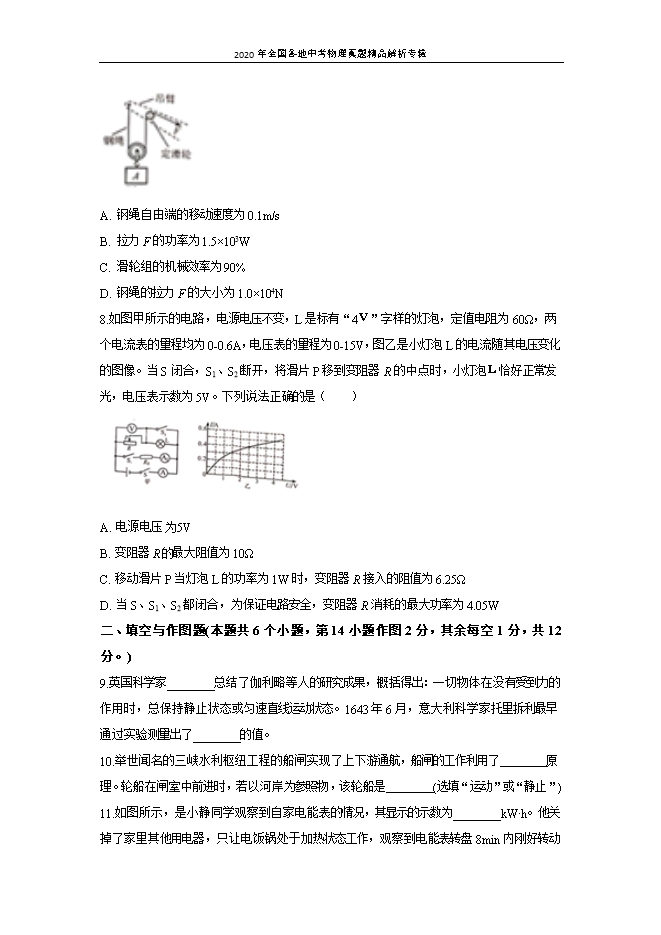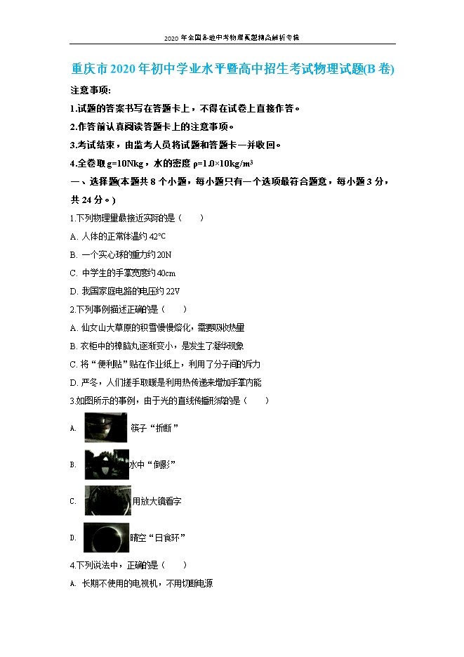 2020年全国各地中考物理真题精品解析专辑:重庆B卷(word解析版和原卷版)