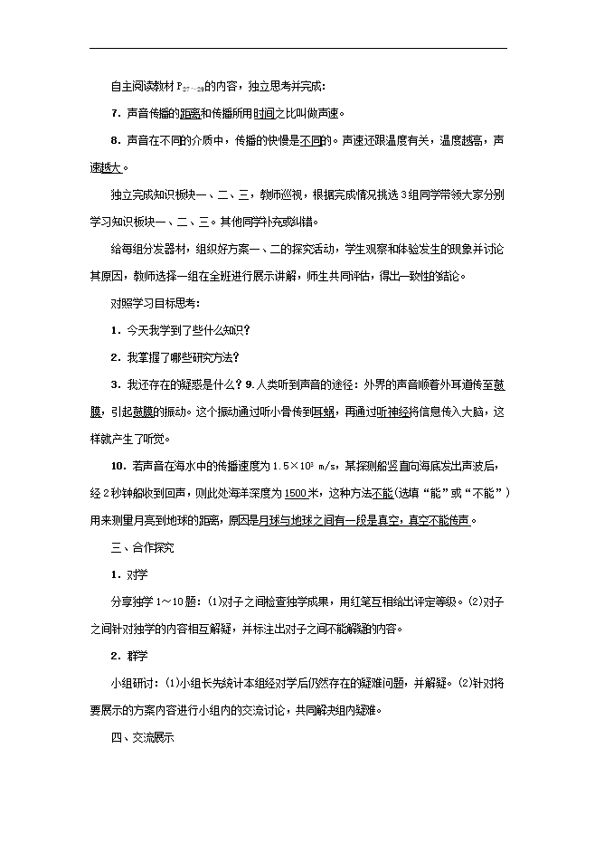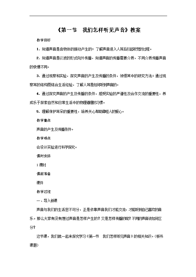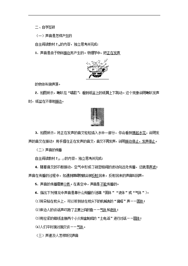 【内容简介】教学目标1.知道声音是由物体的振动产生的;了解声音进入人耳后引起听觉的过程。2.知道声音是以波的形式向外传播,知道声音的传播需要介质,不同介质传播声音的快慢不同。3.通过观察和实验,探究声音的产生及传播的条件,领悟其中的研究方法;通过观察耳的结构图结合生活经验,了解人耳是如何听到声音的。4.通过探究声音的产生及传播的条件,感受实验的严谨性及合作交流的重要性,养成乐于探索自然和日常生活中的物理道理的习惯。5.理解保护耳朵的重要性,培养关心帮助聋哑人的爱心。教学重点声音的产生及传播条件。教学难点会设计实验进行科学探究。课时安排1课时课前准备课件教学过程一、导入新课声音与我们的生活密不可分,正是依靠声音我们才能交流,才能听到自己喜欢的音乐。那么大家有没有想过声音是怎样产生的?又是怎样传播的呢?不同的声音该如何区分?这节课,我们就一起来探究学习《第一节 我们怎样听见声音》的相关知识。(板书课题)二、自学互研(一)声音是怎样产生的自主阅读教材P24的内容,独立思考并完成:1.声音是由于物体振动而产生的。物理学中,把正在发声 的物体叫做声源。2.如图所示,喇叭在“唱歌”,看到纸盆上的纸屑上下跳动。这个现象说明喇叭发声时,纸盆在不停地振动。 3.如图所示,将正在发声的音叉轻轻插入水中一部分,你会看到溅起水花,说明发声的音叉在振动;用手握住正在发声的音叉,音叉不再发声,说明振动停止,发声停止。(二)声音的传播自主阅读教材P25~27的内容,独立思考并完成:4.随着音叉的不断振动,空气中形成了疏密相间的波动向远处传播,这就是声波;声音在传播的过程中,如遇到障碍物就会被反射回来,反射回来的声音叫回声。5.声音的传播需要介质。在真空中,声音是不能传播的。6.指出下列情况中声音是靠什么传播的(选填“固体”“液体”或“气体”)。(1)耳朵贴在枕头上,可以听到放在枕头下的机械表的“滴嗒”声——固体;