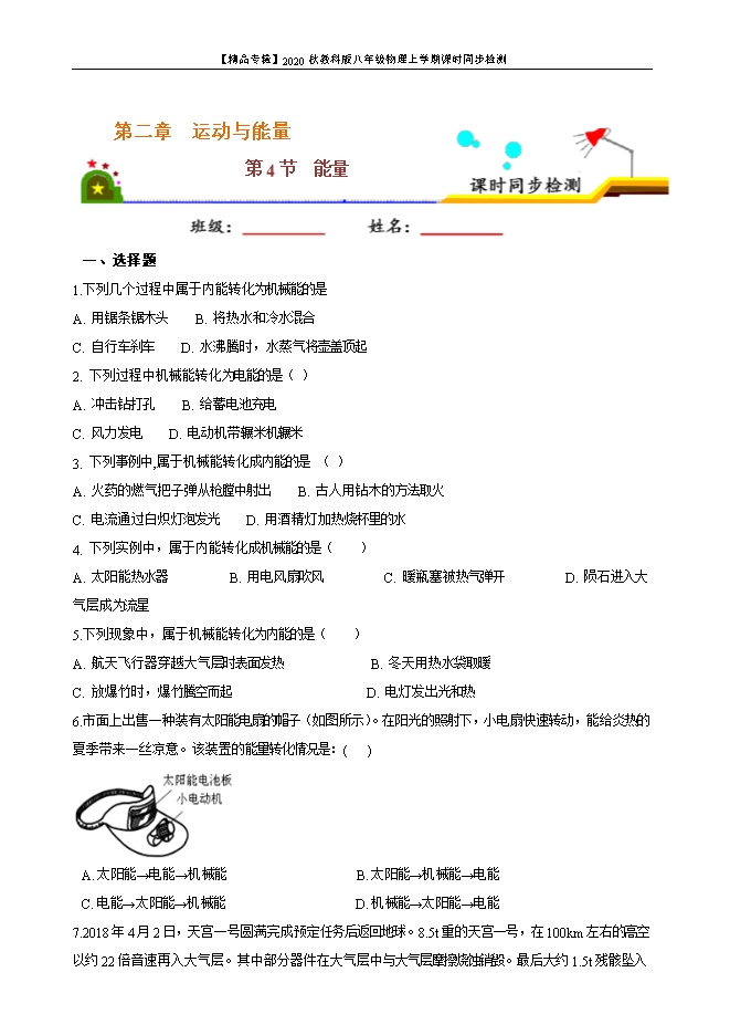 【内容简介】1.下列几个过程中属于内能转化为机械能的是A. 用锯条锯木头 B. 将热水和冷水混合C. 自行车刹车 D. 水沸腾时,水蒸气将壶盖顶起【答案】D【解析】解答:A、锯条锯木条,锯条发热,克服摩擦做功,机械能转化为内能.B、将热水和冷水混合,热水的内能转移到冷水,是内能的转移;C、自行车刹车处发热,是克服摩擦做功,机械能转化为内能;D、水蒸气将壶盖顶起,水蒸气对外做功,内能转化为壶盖的机械能.故选D. 点睛:分析各选择项中什么形式的能在减少,什么形式的能在增加,找到属于内能转化为机械能的物理过程.2. 下列过程中机械能转化为电能的是( )A. 冲击钻打孔 B. 给蓄电池充电C. 风力发电 D. 电动机带辗米机辗米【答案】C【解析】试题分析:明确选项中所列的应用消耗了哪种形式的能,获得了哪种形式的能,即可做出判断.解:A、冲击钻打孔的过程中,消耗了机械能,转化为了内能,不合题意;B、给蓄电池充电的过程中,消耗了电能,获得了化学能,不合题意;C、风力发电的过程中,消耗了风的机械能,获得了电能,符合题意;D、电动机带辗米机辗米的过程中,消耗了电能,获得了机械能,不合题意.故选C.【点评】明确某种机器或应用在工作时消耗的能量和获得的能量,是判断其能量转化的基本思路,难度不大.3. 下列事例中,属于机械能转化成内能的是 ( )A. 火药的燃气把子弹从枪膛中射出 B. 古人用钻木的方法取火C. 电流通过白炽灯泡发光 D. 用酒精灯加热烧杯里的水【答案】B【解析】火药的燃气把子弹从枪膛中射出(内能转化为机械能)古人用钻木的方法取火(机械能转化成内能)电流通过白炽灯泡发光(电能转化为内能和光能)用酒精灯加热烧杯里的水(化学能转化为内能)故选B4. 下列实例中,属于内能转化成机械能的是( )A. 太阳能热水器 B. 用电风扇吹风 C. 暖瓶塞被热气弹开 D. 陨石进入大气层成为流星【答案】C【解析】解答:A. 太阳能热水器是将太阳能转化为水的内能,不合题意;B. 用电风扇吹风,是将电能转化为机械能,不合题意;C. 陨石进入大气层成为流星,是陨石与空气摩擦,将机械能转化为内能,不合题意;D. 暖瓶塞被热气弹开,是气体膨胀对外做功,将内能转化为机械能,符合题意。故选D. 点睛:内能与机械能的转化主要表现在做功改变物体的内能上,内能增大的是机械能转化为内能,内能减少的是内能转化为机械能,而内能的变化主要体现在温度的变化上.5.下列现象中,属于机械能转化为内能的是( )A. 航天飞行器穿越大气层时表面发热 B. 冬天用热水袋取暖C. 放爆竹时,爆竹腾空而起 D. 电灯发出光和热【答案】A【解析】解答:A. 航天飞行器穿越大气层时,与大气层发生摩擦,表面发热内能增加,属于通过做功的方式使内能增加,机械能转化为内能,符合题意;B. 冬天用热水袋取暖,是通过热传递的方式增加物体的内能,不符合题意;C. 爆竹点燃后腾空升起,是爆炸产生的气体的内能转化为爆竹的机械能,不符合题意;D. 电灯消耗电能发出光和热,是电能转化为内能,不符合题意;故选A.点睛:做功和热传递都可以改变物体的内能,做功是能量的转化,热传递是能量的转移.对物体做功可以使机械能转化为内能.6.市面上出售一种装有太阳能电扇的帽子(如图所示)。在阳光的照射下,小电扇快速转动,能给炎热的夏季带来一丝凉意。该装置的能量转化情况是:( ) A. 太阳能→电能→机械能 B. 太阳能→机械能→电能C. 电能→太阳能→机械能 D. 机械能→太阳能→电能【答案】A【解析】帽子上的太阳能电池板将太阳能转化为电能,供小电扇工作。小电扇工作时消耗电能,将电能转化为扇叶的机械能,因此该装置的能量转化情况是太阳能﹣﹣电能﹣﹣机械能,故A正确。7.2018年4月2日,天宫一号圆满完成预定任务后返回地球。8.5t重的天宫一号,在100km左右的高空以约22倍音速再入大气层。其中部分器件在大气层中与大气层摩擦烧蚀销毁。最后大约1.5t残骸坠入南太平洋。在这个过程中,天宫一号的部分机械能( )A. 通过热传递转化为大气的内能 B. 通过重力做功转化为大气的内能C. 通过摩擦做功转化为大气的内能 D. 通过重力做功转化为残骸的内能【答案】C【解析】【详解】天宫一号在100km左右的高空以约22倍音速再入大气层时,高度减小,重力势能减小,克服与大气的摩擦做功,机械能转化为内能,故ABD项错误,C项正确。故选C