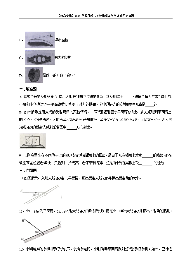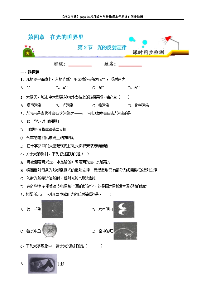 【内容简介】1.光射到平面镜上,入射光线与平面镜的夹角为40°,反射角为A.30°B.40°C.50°D.60°【答案】C【解析】【详解】由题意知,入射角为50°,根据光的反射定律的内容中反射角等于入射角,可知反射角也为50°。故C符合题意。2.大晴天,城市中大型建筑物外表按上的玻璃幕墙,会产生( )A.噪声污染B.光污染C.核污染D.化学污染【答案】B【解析】【分析】【详解】因为玻璃幕墙表面很光滑,所以光照到玻璃幕墙上会发生镜面反射,反射光线很强造成光污染。故选B。3.光污染是当代社会四大污染之一一,下列现象中会造成光污染的是A.晚上学习时用护眼灯B.用塑料薄膜建造温室大棚C.汽车的前挡风玻璃上贴防晒膜D.在十字路口的大型建筑物上面,大面积安装玻璃幕墙【答案】D【解析】【分析】光射到两种介质的界面上时会被反射回原介质中的现象是光的反射,比如:漫反射、镜面反射,目前的光污染主要是镜面反射。【详解】A.晚上的光线较暗,用护眼台灯可以起到对眼睛的保护作用,不会造成光污染,不符合题意;B.利用塑料的透光功能,建大棚时能够使大棚的温度升高,不会造成光污染,不符合题意;C.汽车车窗玻璃上贴太阳膜主要是防止太阳对人体的晒伤,不会造成光污染,不符合题意;D.当光照射在玻璃幕墙时,会发生镜面反射,造成光污染,符合题意。故选D。4.关于光的反射,下列叙述正确的是( )A.月夜迎着月光走,水是暗的;背着月光走,水是亮的B.镜面反射每条光线都遵循光的反射定律,而漫反射只有部分光线遵循光的反射定律C.入射光线靠近法线时,反射光线也靠近法线D.有的学生不能看清老师黑板上写的粉笔字,这是因为黑板发生漫反射的缘故【答案】C【解析】【详解】A.迎着月光走,月光经水面发生镜面反射,进入人的眼睛反射光线多,人感觉水面亮;地面发生漫反射,有很少的光线进入人的眼睛,人感觉地面黑。背着月光走,月光经水面发生镜面反射,没有反射光线进入人的眼睛,人感觉水面暗;地面发生漫反射,有少量的光线反射进入人的眼睛,人感觉地面亮,故A错误;B.镜面反射和漫反射每条光线都遵循光的反射定律,故B错误;C.入射光线靠近法线时,入射角减小,反射角也减小,则反射光线也靠近法线,故C正确;D.有的学生不能看清老师黑板上写的粉笔字,这是因为黑板发生镜面反射的缘故,故D错误。故选C。5.如图所示,下列现象中能用光的反射解释的是( )A.墙上手影 B.水中明月 C.看水中鱼 D.空中彩虹 【答案】B【解析】A.墙上手影是由光的直线传播形成的,故A不符合题意;B.水中明月是由光的反射形成的,故B符合题意;C.看水中鱼是发生了光的折射,故C不符合题意;D.空中彩虹是太阳光通过悬浮在空气中细小的水珠折射而成的,故D不符合题意。故选D。