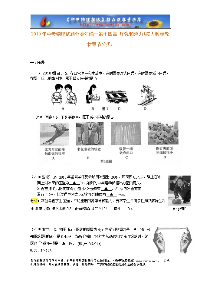 2010年中考物理试题分类汇编--第十四章 压强和浮力(按人教版教材章节分类)