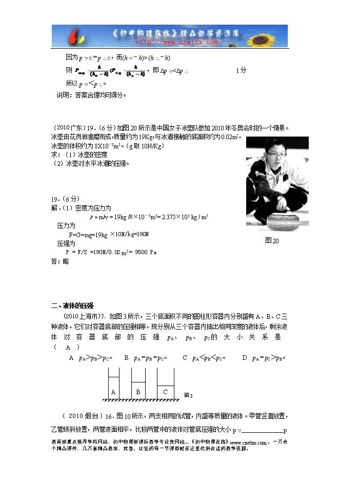 (2010盐城)18.2010年温哥华冬奥会所用冰壶重190N,底面积0.04m2,静止在冰