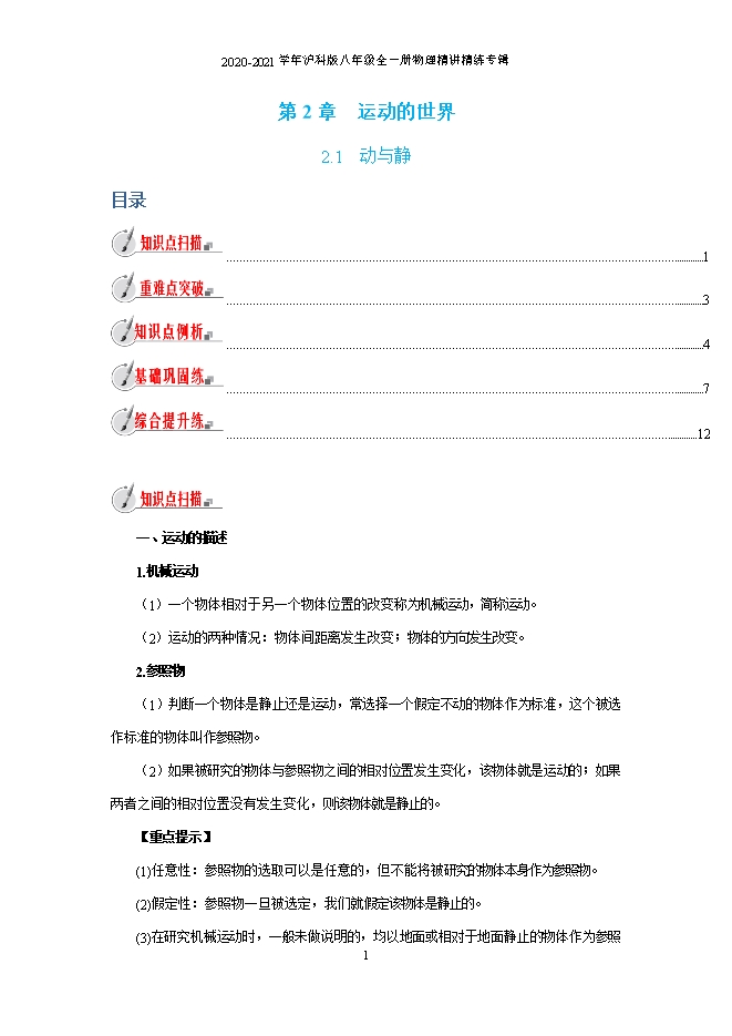 2020-2021学年沪科版八年级全一册物理精讲精练专辑:2.1 动与静(原卷版和解析版)