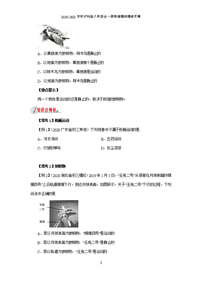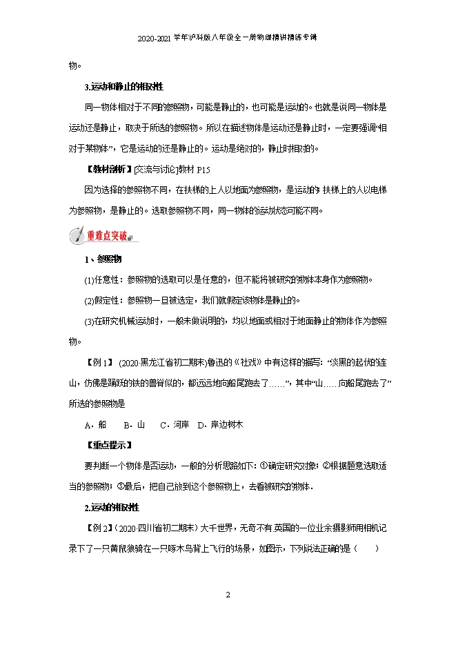 【内容简介】一、运动的描述1.机械运动(1)一个物体相对于另一个物体位置的改变称为机械运动,简称运动。(2)运动的两种情况:物体间距离发生改变;物体的方向发生改变。2.参照物(1)判断一个物体是静止还是运动,常选择一个假定不动的物体作为标准,这个被选作标准的物体叫作参照物。(2)如果被研究的物体与参照物之间的相对位置发生变化,该物体就是运动的;如果两者之间的相对位置没有发生变化,则该物体就是静止的。【重点提示】(1)任意性:参照物的选取可以是任意的,但不能将被研究的物体本身作为参照物。(2)假定性:参照物一旦被选定,我们就假定该物体是静止的。(3)在研究机械运动时,一般未做说明的,均以地面或相对于地面静止的物体作为参照物。3.运动和静止的相对性同一物体相对于不同的参照物,可能是静止的,也可能是运动的。也就是说同一物体是运动还是静止,取决于所选的参照物。所以在描述物体是运动还是静止时,一定要强调“相对于某物体”,它是运动的还是静止的。运动是绝对的,静止时相对的。【教材剖析】[交流与讨论]教材P15因为选择的参照物不同,在扶梯的上人以地面为参照物,是运动的;扶梯上的人以电梯为参照物,是静止的。选取参照物不同,同一物体的运动状态可能不同。 1、参照物(1)任意性:参照物的选取可以是任意的,但不能将被研究的物体本身作为参照物。(2)假定性:参照物一旦被选定,我们就假定该物体是静止的。(3)在研究机械运动时,一般未做说明的,均以地面或相对于地面静止的物体作为参照物。【例1】 (2020•黑龙江省初二期末)鲁迅的《社戏》中有这样的描写:“淡黑的起伏的连山,仿佛是踊跃的铁的兽脊似的,都远远地向船尾跑去了……”,其中“山……向船尾跑去了”所选的参照物是A.船B.山C.河岸D.岸边树木【答案】A【解析】A、以船为参照物,船与山之间的距离发生了变化,而且船向前行,以船为参照物,山在“后退”.故A符合题意;B、若以山本身为参照物,那它只能是静止的,而且一般是不能选研究对象为参照物.故B不符合题意;C、以河岸为参照物,山与河岸之间的位置没有发生变化,山是不动的.故C不符合题意;D、以岸边的树为参照物,山与岸边的树的位置没有发生了变化,山是不动的.故D不符合题意.