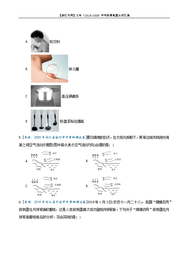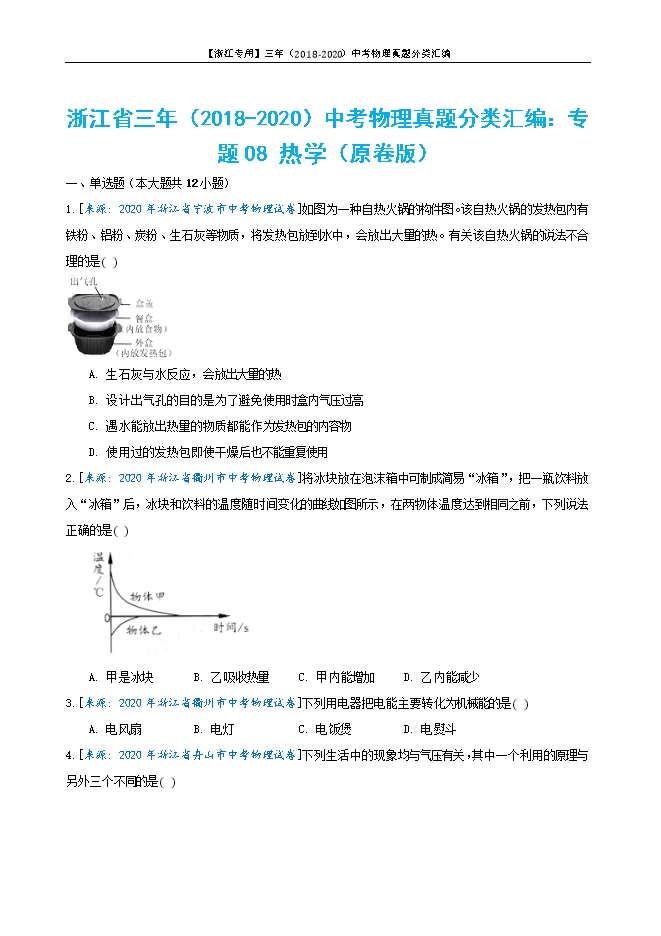 【内容简介】1.[来源: 2020年浙江省宁波市中考物理试卷]如图为一种自热火锅的构件图。该自热火锅的发热包内有铁粉、铝粉、炭粉、生石灰等物质,将发热包放到水中,会放出大量的热。有关该自热火锅的说法不合理的是( ) A. 生石灰与水反应,会放出大量的热B. 设计出气孔的目的是为了避免使用时盒内气压过高C. 遇水能放出热量的物质都能作为发热包的内容物D. 使用过的发热包即使干燥后也不能重复使用【答案】C【解析】解:A、由化学知识可知,生石灰与水发生化学反应,会释放出大量的热量,故A正确;B、盒盖上有出气孔,这样会避免使用时盒内气压过高,能防止危险的发生;故B正确;C、发热包用于自热食品,要注意发热材料不能有强腐蚀性和毒性,所以不是遇水能放出热量的物质都能作为发热包的内容物,故C错误;D、使用过的发热包发生了化学变化,干燥后不能重复使用,故D正确。本题选错误的;故选:C。(1)生石灰与水反应时,会放出热量;(2)盒盖上有出气孔,能维持气压的平衡;(3)(4)根据发热包的用途分析。本题是一道学科综合题,考查了关于化学反应以及气压的知识,难度不大。2.[来源: 2020年浙江省衢州市中考物理试卷]将冰块放在泡沫箱中可制成简易“冰箱”,把一瓶饮料放入“冰箱”后,冰块和饮料的温度随时间变化的曲线如图所示,在两物体温度达到相同之前,下列说法正确的是( ) A. 甲是冰块B. 乙吸收热量C. 甲内能增加D. 乙内能减少【答案】B【解析】解:由图可知,物体甲的温度是降低的,即物体甲放出热量,内能减小;物体乙的温度是升高的,即物体乙吸收热量,内能变大;所以物体甲是饮料,乙是冰块;故B正确,ACD错误。故选:B。两个温度不同的相互接触时,会发生热传递现象;高温物体放出热量,低温物体吸收热量。本题考查了改变内能的方法,知道热传递的条件和特点是解题的关键。3.[来源: 2020年浙江省衢州市中考物理试卷]下列用电器把电能主要转化为机械能的是( )A. 电风扇B. 电灯C. 电饭煲D. 电熨斗【答案】A【解析】解:电灯在工作时将电能转化为光能和内能,电熨斗和电饭锅在工作时将电能转化为内能,故BCD不符合题意;而电风扇可以将电能转化为机械能,故A符合题意。故选:A。电流做功的过程实质上是电能转化为其它形式能的过程,用电器消耗了电能,获得了其它形式的能量,就是一个电流做功的过程。本题考查了学生对电流做功的实质的认识和了解,属于基础题目。4.[来源: 2020年浙江省舟山市中考物理试卷]下列生活中的现象均与气压有关,其中一个利用的原理与另外三个不同的是( )A. 吸饮料B. 拔火罐C. 高压锅煮饭D. 吸盘紧贴在墙面【答案】C【解析】解:ABD选项中、吸饮料、拔火罐、吸盘吸在墙上这三项都是利用了大气压来完成的;而C选项中高压锅是根据气压越高沸点越高来工作的。故选:C。(1)用吸管吸饮料时,嘴内的气压小于外界大气压,在大气压力的作用下被压入嘴中。(2)拔火罐时,罐内的气压小于罐外的大气压,大气压就将罐紧紧地压在皮肤上。(3)高压锅密封好,锅内气压高于外面大气压,而液体的沸点与气压有关,气压越高沸点越高,所以高压锅内水的沸点高于100℃,高压锅与大气压无关。(4)先赶出吸盘内的空气,使吸盘内的气压小于吸盘外的大气压,外界大气压将吸盘紧紧压在墙壁上。本题考查了大气压强在生活中的应用和液体的沸点与气压的关系问题,本题难度不大,属于常考题。
