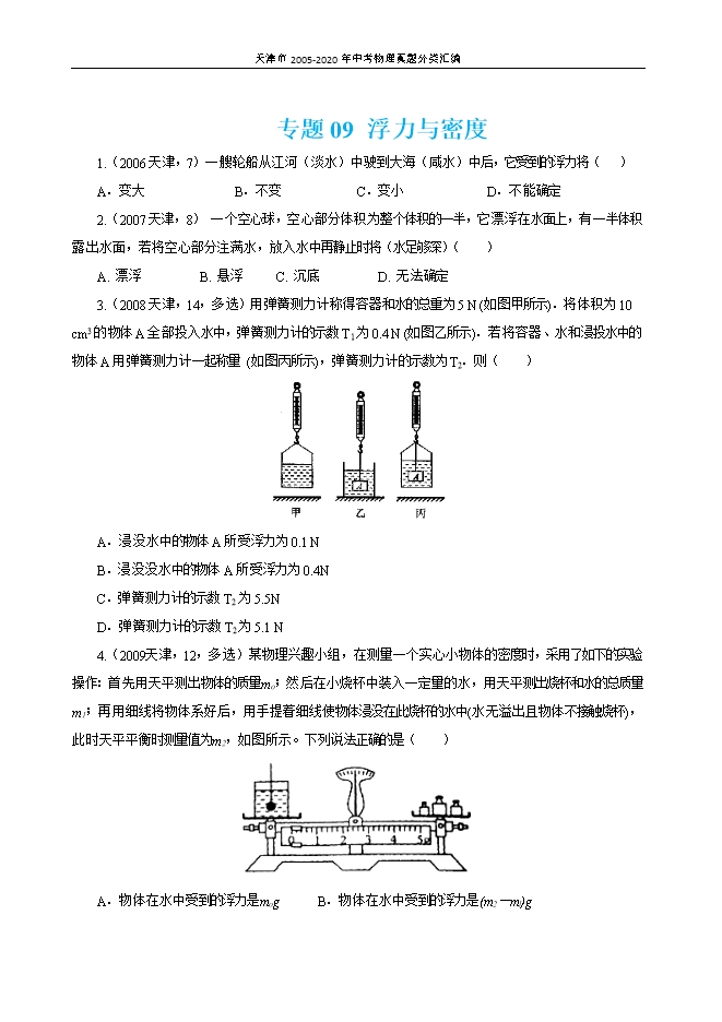 天津市2005-2020年中考物理真题分类汇编:专题09 浮力与密度(原卷版和解析版)