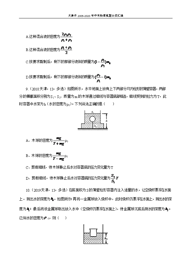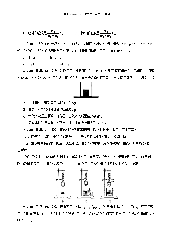 【内容简介】1.(2006天津,7)一艘轮船从江河(淡水)中驶到大海(咸水)中后,它受到的浮力将( )A.变大 B.不变 C.变小 D.不能确定【答案】B【解析】当船由江河驶入大海后,都是漂浮,船受到的浮力等于重力,∵船受到的重力G不变,∴船受到的浮力不变.故选B2.(2007天津,8) 一个空心球,空心部分体积为整个体积的一半,它漂浮在水面上,有一半体积露出水面,若将空心部分注满水,放入水中再静止时将(水足够深)( )A. 漂浮B. 悬浮C. 沉底D. 无法确定【答案】B【解析】没有注入水时,∵球漂浮,∴F浮=G球=ρ水gv/2,注入水浸没水中后∵F浮′=ρ水vg,G=G球+G水=ρ水gv/2+ρ水gv/2=ρ水vg,∴F浮′=G。所以把球的空心部分注满水浸没水中静止释放后将悬浮.故选B.3.(2008天津,14,多选)用弹簧测力计称得容器和水的总重为5 N (如图甲所示).将体积为10 cm3的物体A全部投入水中,弹簧测力计的示数T1为0.4 N (如图乙所示).若将容器、水和浸投水中的物体A用弹簧测力计一起称量 (如图丙所示),弹簧测力计的示数为T2.则( ) A.浸没水中的物体A所受浮力为0.1 NB.浸没没水中的物体A所受浮力为0.4NC.弹簧测力计的示数T2为5.5ND.弹簧测力计的示数T2为5.1 N【答案】AC 【解析】∵V排=V=10cm3=10×10-6m3,∴浸没水中的物体A所受浮力:F浮=ρ水V排g=1×103kg/m3×10×10-6m3×10N/kg=0.1N;故A正确。∵F浮=G-F′,∴G=F浮+F′=0.1N+0.4N=0.5N,弹簧测力计的示数:T2=5N+0.5N=5.5N.故C正确。故选AC。4.(2009天津,12,多选)某物理兴趣小组,在测量一个实心小物体的密度时,采用了如下的实验操作:首先用天平测出物体的质量mo;然后在小烧杯中装入一定量的水,用天平测出烧杯和水的总质量m1;再用细线将物体系好后,用手提着细线使物体浸没在此烧杯的水中(水无溢出且物体不接触烧杯),此时天平平衡时测量值为m2,如图所示。下列说法正确的是( ) A.物体在水中受到的浮力是mogB.物体在水中受到的浮力是(m2一ml)gC.物体的密度是 D.物体的密度是 【答案】BC 【解析】①实心物体浸没水中重新平衡后,根据F左=F右,即:m1g+G球-F拉=m2g,得F浮=G-F拉=(m2-m1)g;故B正确。②根据阿基米德原理,物体的体积V=V排=F浮/ρ水g,所以物体的密度 ,故C正确。故选B、C.5.(2010天津,14,多选)甲、乙两个质量相等的实心小球,密度分别为ρ甲、ρ乙,且ρ甲:ρ乙=3:2。将它们放入足够深的水中,甲、乙两球静止时所受浮力之比可能的是( )A.3:2 B.1:1C.ρ水:ρ乙 D.ρ水:ρ甲【答案】BD【解析】①当两小球都漂浮或一球漂浮一球悬浮时,浮力等于它们自身重力.又因为两小球质量相等,则重力相等,浮力比为1:1;②当两小球都下沉时,排开水的体积等于它们自身的体积,根据F浮=ρ水gV排,它们的浮力比等于它们的体积比,它们的质量相等,根据密度公式ρ=m/V,它们的体积比等于它们的密度的倒数比,即2:3。③当一个漂浮一个下沉时,因为乙的密度小,所以是甲下沉乙漂浮,则F浮甲=ρ水gV排甲=ρ水gV甲,F浮乙=G乙=G甲=ρ甲gV甲,F浮甲:F浮乙=ρ水:ρ甲.故选B、D6.(2012天津,14,多选)如图所示,将底面半径为2R的圆柱形薄壁容器放在水平桌面上,把高为h,密度为ρ(ρ<ρ水).半径为R的实心圆柱体木块竖直放在容器中,然后向容器内注水,则( ) A.注水前,木块对容器底的压力为ρghB.注水前,木块对容器底的压强为ρghC.若使木块竖直漂浮,向容器中注入水的质量至少为πR2ρhD.若使木块竖直漂浮,向容器中注入水的质量至少为3πR2ρh【答案】BD
