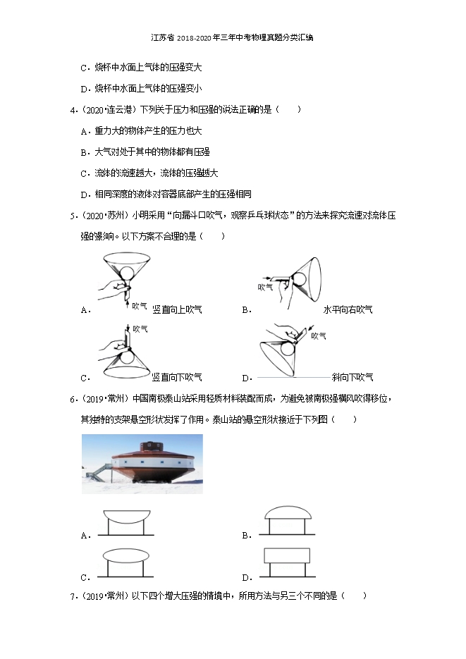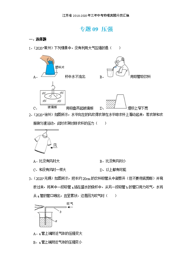 【内容简介】1.(2020•常州)下列情景中,没有利用大气压强的是( )A. 杯中水不流出B. 用吸管吸饮料C. 用吸盘吊起玻璃板D. 堤坝上窄下宽【答案】D【解析】A、覆杯实验,是大气压强托住了纸片,故A不合题意;B、用吸管吸饮料时,吸出吸管中的部分空气,使吸管内的气压减小,瓶中饮料在大气压的作用下,上升通过吸管进入口中,利用大气压强,故B不合题意;C、用吸盘吊起玻璃板,先把吸盘内的空气排尽,是大气压强托住玻璃把玻璃吊起,故是利用大气压强,故C不合题意;D、堤坝上窄下宽,是利用液体压强随深度的增加而增大,没有利用大气压,故D符合题意。故选:D。2.(2020•徐州)如图所示,水平向左的风吹得衣架在水平晾衣杆上滑动起来,若衣架和衣服做匀速运动,此时衣架对晾衣杆的压力( ) A.比没有风时大B.比没有风时小C.和没有风时一样大D.以上都有可能【答案】C【解析】衣架对晾衣杆的压力是因为它的重力产生的,向左的风吹得衣架在水平晾衣杆上滑动起来,使得衣架及衣服整体水平向左匀速直线运动,不影响重力的大小,也没有增加对晾衣杆的压力,故C正确,ABD错误。故选:C。3.(2020•无锡)如图所示,把长约20cm的饮料吸管从中部剪开(但不要彻底剪断)并弯折过来,将其中一段吸管a插在盛水的烧杯中,从另一段吸管b的管口用力吹气,水将从a管的管口喷出,且呈雾状,这是因为吹气时( ) A.a管上端附近气体的压强变大B.a管上端附近气体的压强变小C.烧杯中水面上气体的压强变大D.烧杯中水面上气体的压强变小【答案】B【解析】往B管中轻轻吹气,可以看到a管中的水面上升,原因是:往b管中吹气,吸管a上方空气的流速增大,压强减小,a管中液体受到向上的压强大于向下的压强,所以a管水上升后从管口喷出;烧杯中水面上气体的压强是不变,故B正确、ACD错误。故选:B。4.(2020•连云港)下列关于压力和压强的说法正确的是( )A.重力大的物体产生的压力也大B.大气对处于其中的物体都有压强C.流体的流速越大,流体的压强越大D.相同深度的液体对容器底部产生的压强相同【答案】B【解析】A、物体重力越大,产生的压力不一定越大,只有水平面上的物体,产生的压力等于其重力;故A错误;B、大气受重力并且具有流动性,因此会对处于其中的物体产生压强,这个压强叫做大气压强,故B正确;C、流体的流速越大,则流体的压强越小,故C错误;D、相同深度的液体对容器底部产生的压强的大小与液体的密度有关,液体密度不同,产生的压强不同,故D错误。故选:B。