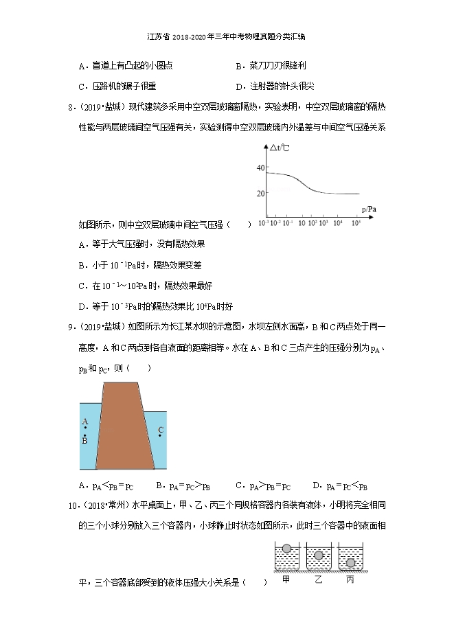 专题09 压强--江苏省2018-2020年三年中考物理真题分类汇编(原卷版和解析版)