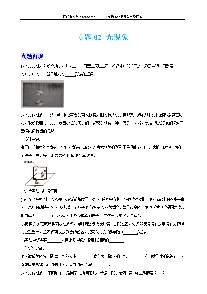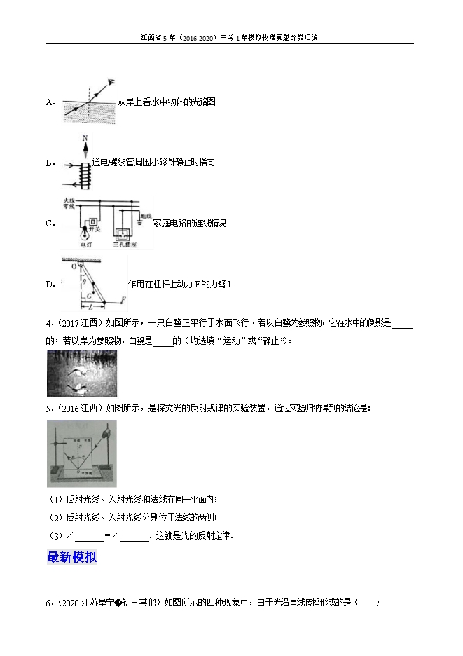 【内容简介】真题再现1.(2020江西)如图所示,湖面上一只白鹭正展翅上冲,若以水中的“白鹭”为参照物,白鹭是______的;水中的“白鹭”是光的______形成的虚像。 【答案】运动 反射 【解析】【分析】【详解】[1]湖面上一只白鹭正展翅上冲,白鹭和它所成的像相对于水面是对称的,以水中的“白鹭”为参照物,白鹭相对于水中的“白鹭”向相反方向飞行,白鹭是运动的。[2]白鹭在水上的倒影是平面镜成像现象,是由于光的反射形成的。2.(2019江西)公共场所中经常看到有人饶有兴趣地低头玩手机游戏,殊不知手机中还有很多其它功能.爱好物理的“620“创新小组的同学们,发现手机有一种“镜子“功能.于是,激起了他们探究平面镜成像特点的兴趣.(设计实验)由于用手机中的“镜子”作平面镜进行实验,无法找到像的位置.于是他们选用了玻璃板、规格相同的两个棋子、白纸等,组装成如图所示的实验装置. (进行实验与收集证据)(1)小华同学将棋子A移到玻璃板前某位置不动,小普同学在板一领帮忙移动棋子B,无能小普在水平桌面上怎样移动棋子B,小华都看不到棋子B与棋子A的像重合.善于观察的小林同学发现这是因为玻璃板与桌面_________,调整后,小华便能看到棋子B与棋子A的像完全重合.(2)把棋子A在玻璃板前移动多次,同时调整玻璃板后棋子B的位置,每次都使得棋子B与棋子A的像的位置重合,这不仅可以找到像的位置,还可以比较出像与物的________关系.(3)实验中还需要________,用来测量像与物到玻璃板的________.(分析与论证)平面镜成像的特点是:像与物的大小________;像与物到镜面的距离________.利用数学中的知识,平面镜成像的规律也可以表述为:像与物关于镜面________.【答案】垂直 大小 刻度尺 距离 相等 相等 轴对称 【解析】【分析】【详解】(1)由平面镜的成像特点,像物关于镜面对称可知:玻璃板如果不竖直,无论怎样在桌面上移动棋子B,都无法使它与棋子A的像完全重合.(2)两只蜡烛大小相同,蜡烛B又和蜡烛A的像完全重合,这样就证明了像与物大小相同,所以两只蜡烛等长是为了比较像与物大小关系用的.(3)为了比较像与物到平面镜距离,还需要刻度尺测量像与物到玻璃板的距离.通过实验可以得出平面镜成像的特点是:像与物的大小相等;像与物到镜面的距离相等,物像连线与镜面垂直.利用数学中的知识,平面镜成像的规律也可以表述为:像与物关于镜面轴对称.3.(2018江西)如图所示,是同学们所画的几种情景下的示意图,其中不正确的是( )A. 从岸上看水中物体的光路图B. 通电螺线管周围小磁针静止时指向C. 家庭电路的连线情况D. 作用在杠杆上动力F的力臂L【答案】ABD【解析】【详解】A、从岸上看水中物体,水中物体反射的光斜射到水面时,光发生折射远离法线后进入眼睛,即折射角应大于入射角,而图中的折射角小于入射角;故A错误;B、根据安培定则,右手握住螺线管,四指指向电流的方向,大拇指指向螺线管的下端,即下端为N极,其上端为S极,由磁极间的相互作用规律可知,小磁针的下端应为N极,故B错误;C、根据安全用电原则可知,火线先进入开关,再接灯泡顶端的金属点,零线直接接在灯泡的螺旋套上;三孔插座上孔接地线,左孔接零线,右孔接火线,故C正确;D、由图可知,O为支点,图中动力F的力臂是指从支点O到力F作用线的距离,而图中是截取了力的作用线的一部分,故D错误。故选ABD。【点睛】右手螺旋定则应用时,要注意四指弯曲指向电流的方向,千万不要理解成线圈的绕向,有同学容易在这点混淆,有个简单的方法,即使用右手螺旋定则前先把电流方向标在线圈上。