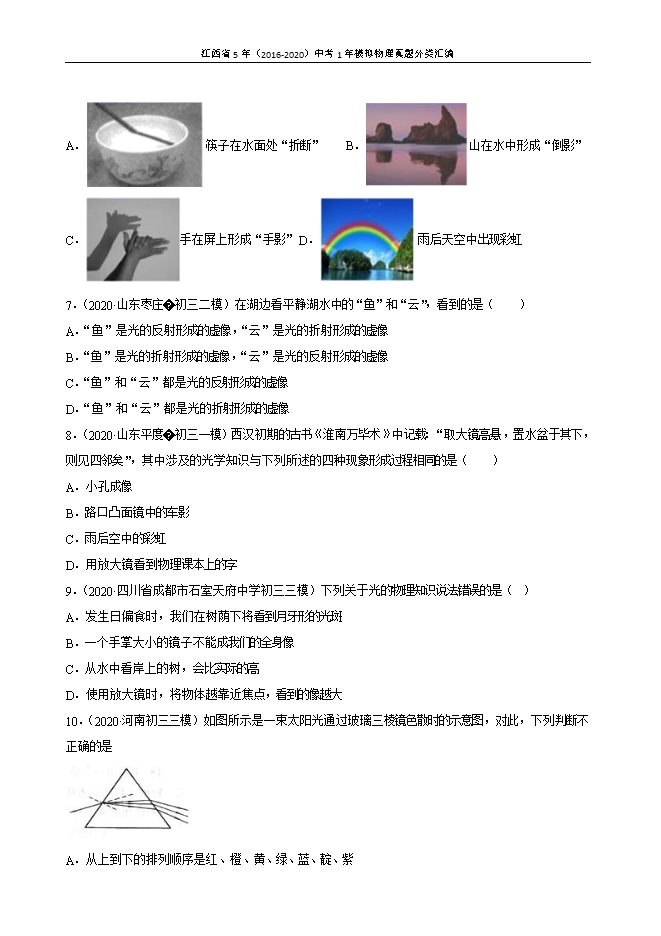 江西省5年(2016-2020)中考1年模拟物理真题分类汇编:专题02 光现象(原卷版和解析版)