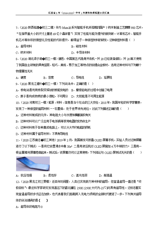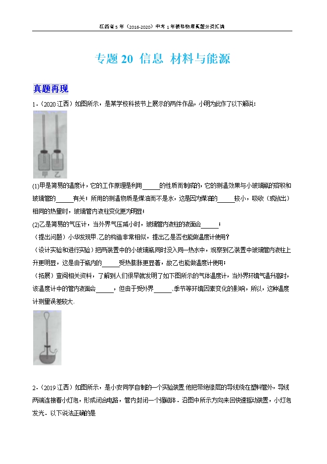 江西省5年(2016-2020)中考1年模拟物理真题分类汇编:专题20 信息材料与能源(原卷版和解析版)