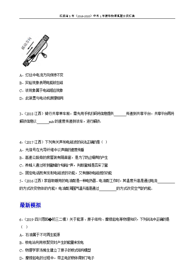 - 1144江西省5年(2016-2020)中考1年模拟物理真题分类汇编:专题19 电与磁(原卷版和解析版)