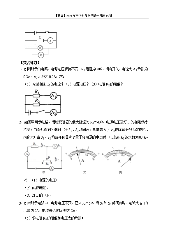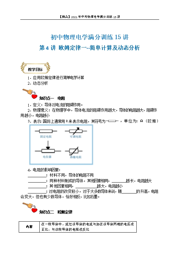 【精品】2021年中考物理电学满分训练15讲:第4讲 欧姆定律一(简单计算及动态分析)(原卷版和解析版)