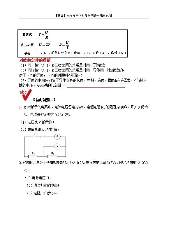 【内容简介】知识点一 电阻1.定义:导体对电流的阻碍作用。2.物理意义:在物理学中,导体电流的阻碍作用越大,导体的电阻越大,阻碍作用越小,电阻越小3.表示:国际上通常用R来表示电阻,其符号为 ,单位为:Ω(欧姆) 4.电阻的影响因素: :材料不同,导体的电阻不同 :同种材料制成的导体,其他因素相同, 越长,电阻越大 :其他因素相同, 越大,电阻越小 :对电阻的改变较小,对于大多数导体来说,随 的升高,电阻会变大,但也有少数导体,恰好相反,比如石墨。 知识点二 欧姆定律内容在一段导体中,流过该导体的电流与加在该导体两端的电压成正比,与该段导体的电阻成反比表达式 公式拓展 单位U、I、R的单位分别为:伏特(V)、安培(A)、欧姆(Ω)对欧姆定律的理解(1)同一性:U、I、R三者之间的关系是对同一导体而言(2)同时性:U、I、R三者之间的关系是对同一导体同一时刻而言的,对于不同的导体,不同的时间则不能混用!(3)导体的电阻只取决于导体本身的长度、材料、温度、横截面积等因素,不与其两端的电压、及流过的电流成比。 【经典例题一】1.如图所示的电路中,电源电压恒定为6V,定值电阻R1的阻值为10Ω,开关S闭合后,电流表的示数为0.2A,求:(1)电压表V的示数;(2)定值电阻R2的阻值。 【解答】解:由电路图可知,R1与R2串联,电压表V测R1两端的电压,电流表测电路中的电流。(1)由I= 可得,电压表V的示数即R1两端的电压:U1=IR1=0.2A×10Ω=2V;(2)因串联电路中总电压等于各分电压之和,所以,R2两端的电压:U2=U﹣U1=6V﹣2V=4V;由I= 可得,电阻R2的阻值:R2= = =20Ω。2.如图所示电路,已知电流表的示数为0.2A,电压表的示数为8V,灯泡L的电阻为20Ω求:(1)电源电压U; (2)通过灯泡的电流; (3)电阻R的大小。 【解答】解:由电路图可知,电阻R与灯泡L并联,电压表测电源的电压,电流表测通过R的电流。(1)由电压表的示数8V可知,电源的电压U=8V;(2)因并联电路中各支路两端的电压相等,所以,通过灯泡的电流:IL= = =0.4A;(3)R的阻值:R= = =40Ω。【变式练习】1.如图所示的电路,电源电压保持不变,R1阻值为20Ω.闭合开关,电流表A1示数为0.3A,A2示数为0.5A,求:(1)流过电阻R1的电流?(2)电源电压?(3)电阻R2的阻值?