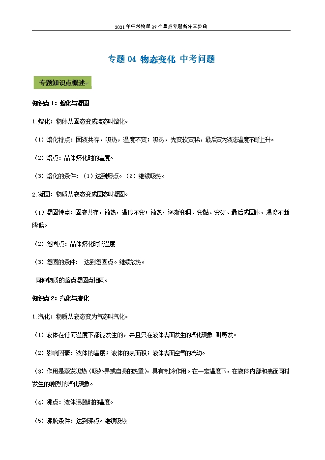 专题04 物态变化--2021年中考物理37个重点专题高分三步曲(原卷版和解析版)